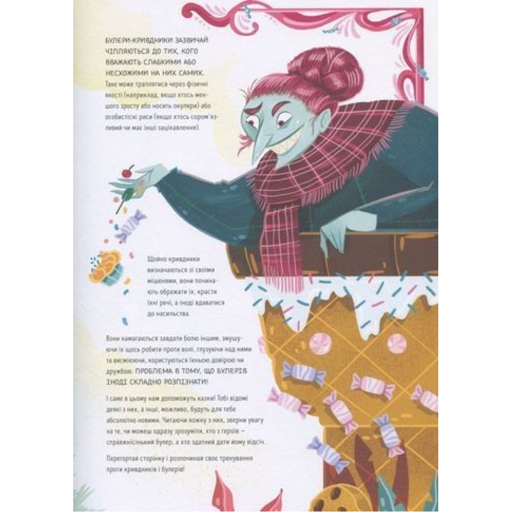 В книге от Элеоноры Форнасари — «Преодолей буллинг вместе с героями сказок» — легко узнать двенадцать известных злодеев-булеров из известных сказок: сведенных сестер из сказки о Золушке, Людоеда из сказки о Мальчике-Мизинчике и Королеве-о-м. Иногда завистливые колдуньи, свирепые великаны и страшные волки не слишком отличаются от буллеров, которых можно встретить в школе, в парке, на футбольном поле или в интернете.