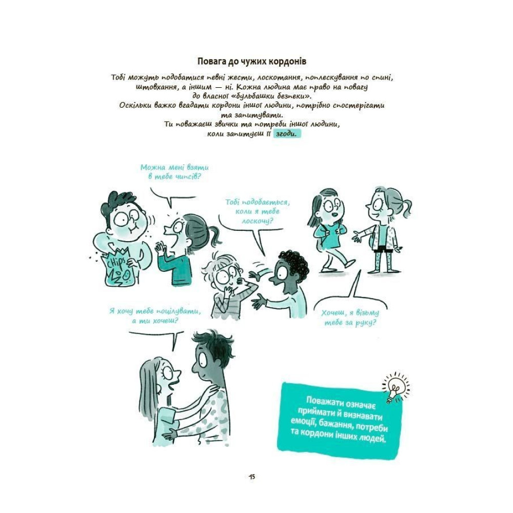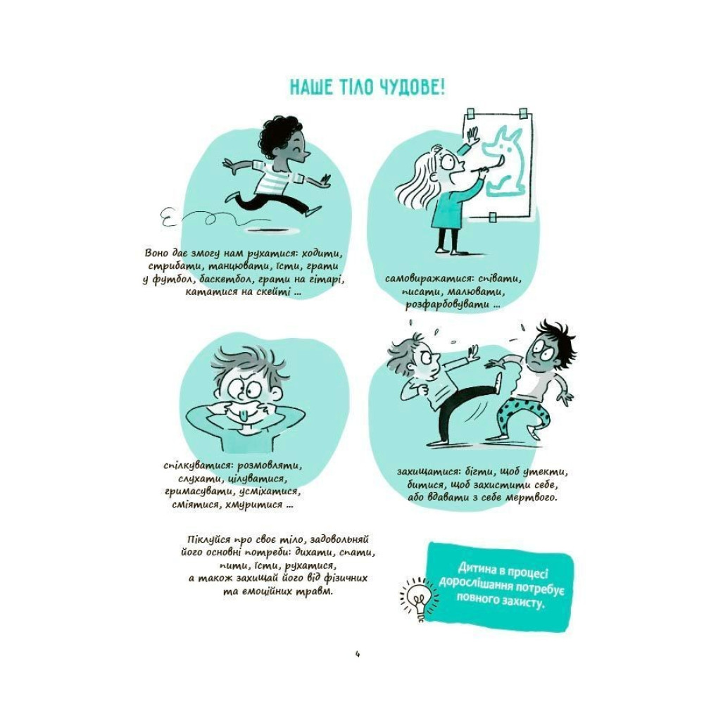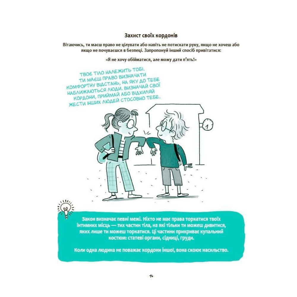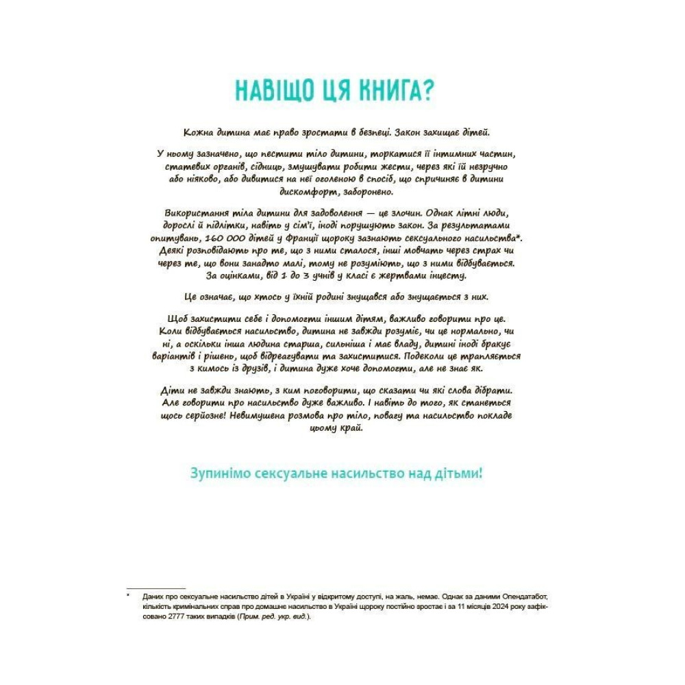 В книге также размещена информация о том, как закон защищает детей, описано, какие действия неприемлемы и почему нужно обо всем рассказывать людям, которым доверяешь, указано, к кому обращаться за помощью. Простые слова, важные идеи, которые научат детей говорить НЕТ, чтобы окружающие уважали их телесную целостность