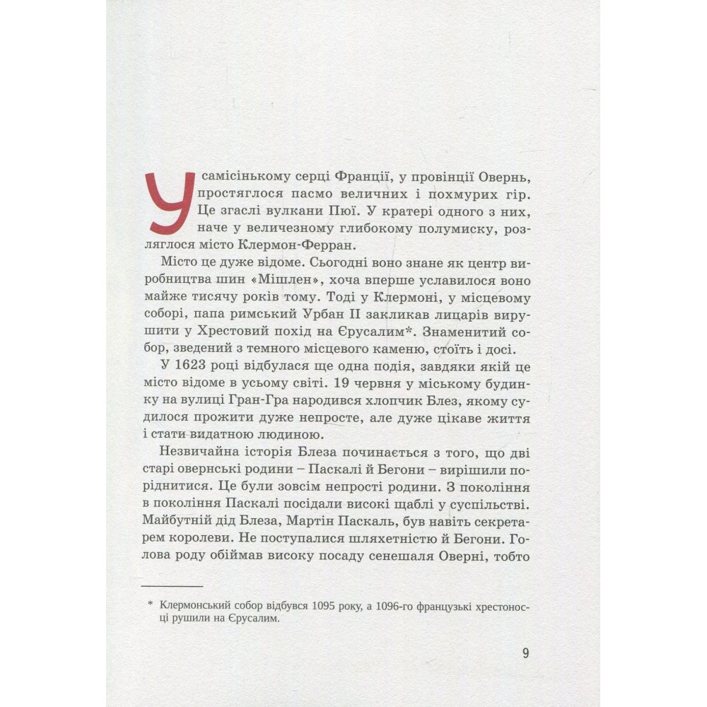 Однойменна книга Ольги Опанасенко про Блеза Паскаля захопить як дитину, так і дорослого. До того ж її можна читати разом, обговорюючи та роблячи висновки з прочитаного. У кінці кожного розділу є добірка питань-завдань, що допоможуть запам’ятати цікаві та важливі факти, а також зробити власні висновки щодо подій у житті головного героя.