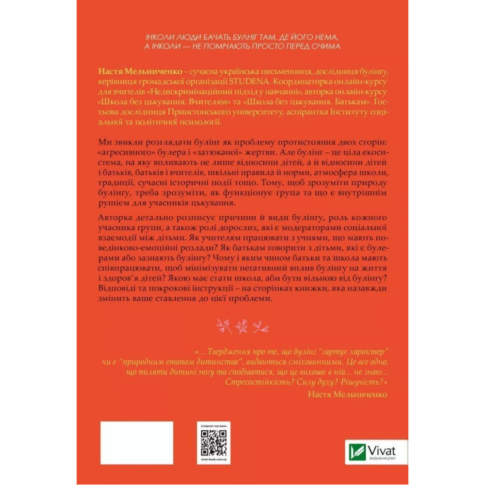 Анастасія Мельниченко у своїй книзі «Зрозуміти (і здолати) булінг. Дізнайтеся про булінг більше, щоб його стало менше» детально розписує причини й види булінгу, роль кожного учасника групи, а також ролі дорослих, які є модераторами соціальної взаємодії між дітьми.