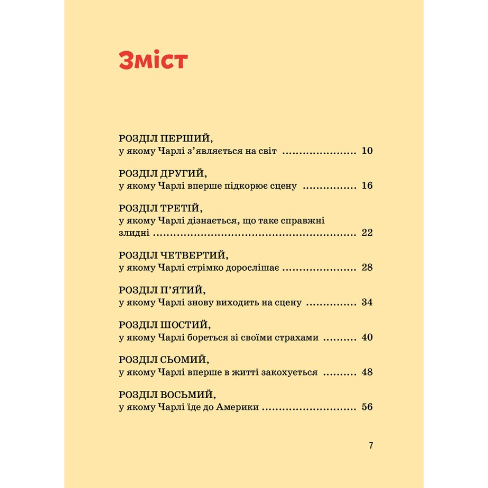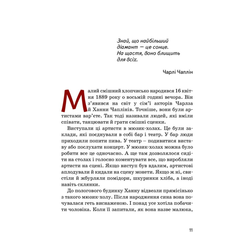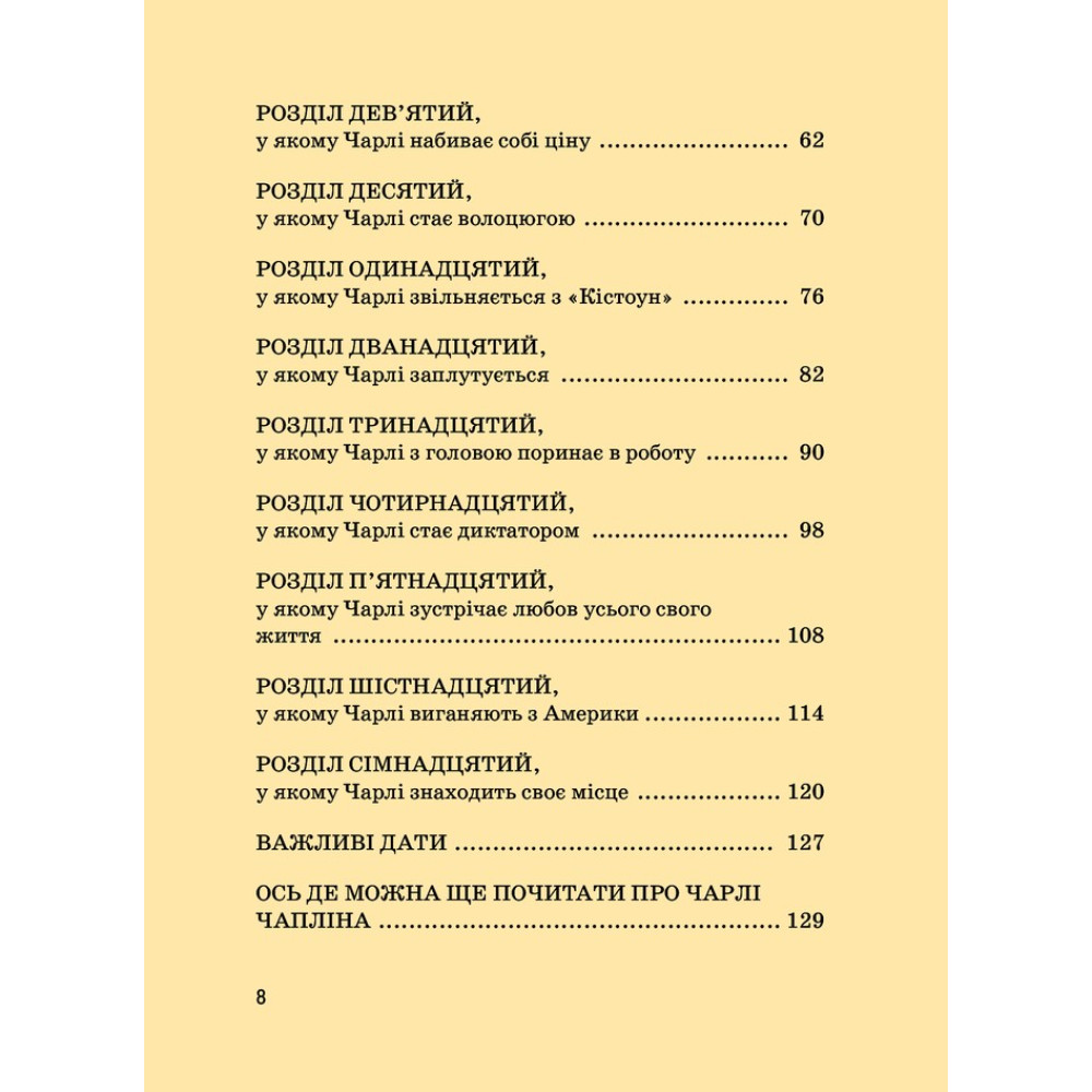 «Чарлі Чаплін» Марії Сердюк — це книга-біографія про дивовижну людину, чиє ім’я знає весь світ. Його образ зможе впізнати кожен, адже образ людини з тростиною, в капелюсі-казанку, в великих штанях і черевиках такий же відомий як і сам Чарлі Чаплін.