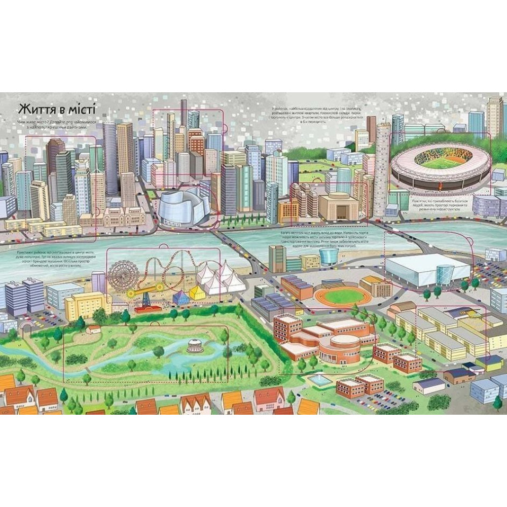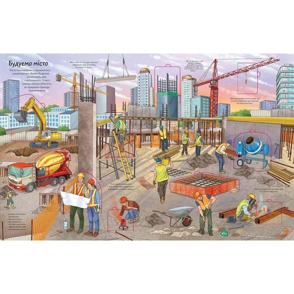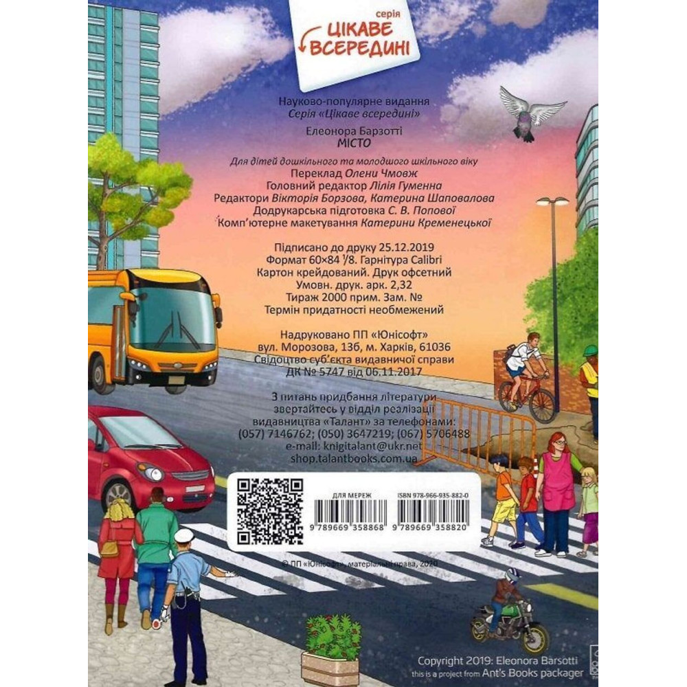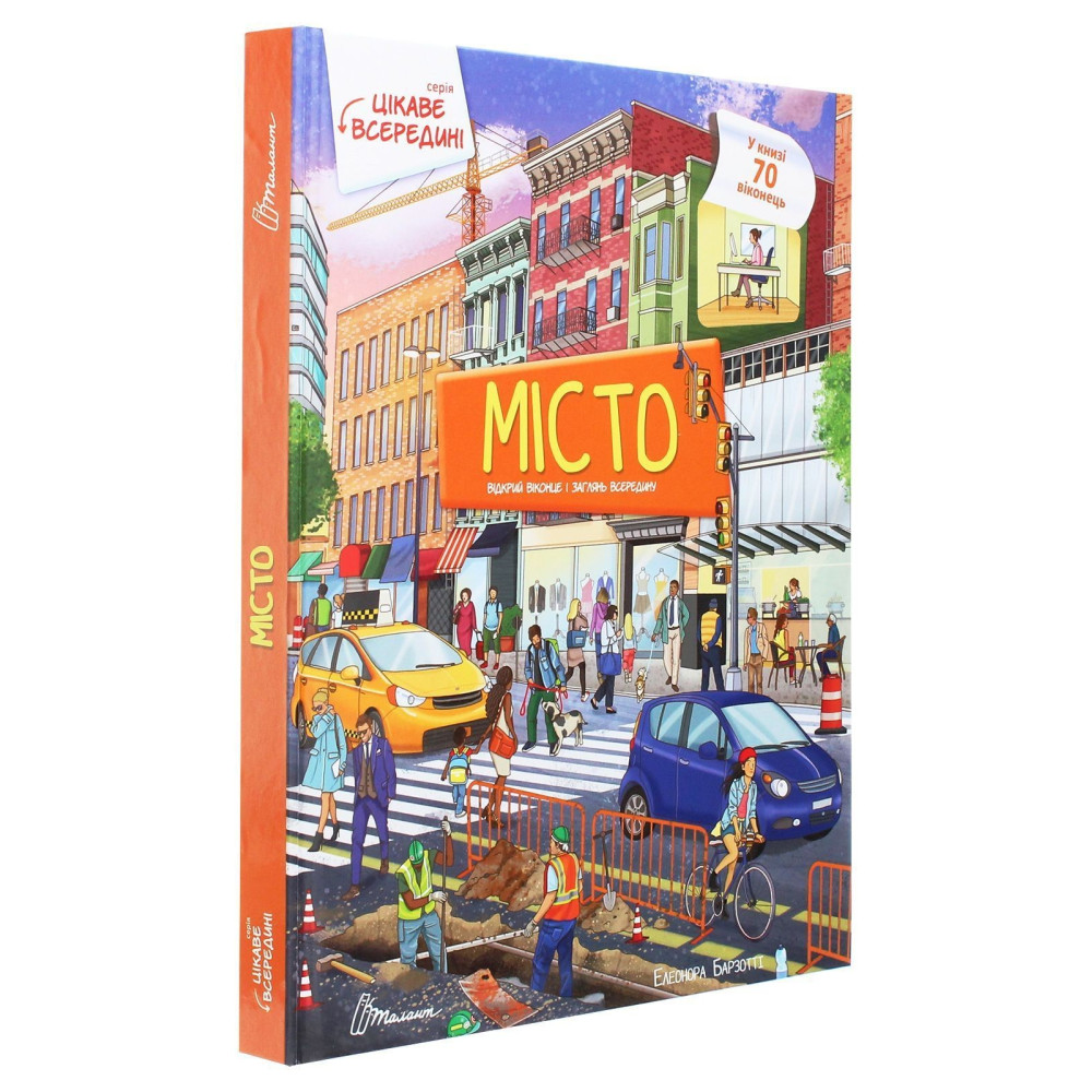 «Цікаве всередині. Місто» від Елеонори Барзотті — це яскрава книга з віконцями, яка допоможе розпочати захопливу подорож не лише вулицями мегаполісу, а й підземним містом — лабіринтами метро, та навіть опинитися під небом — на вершині найвищих хмарочосів!