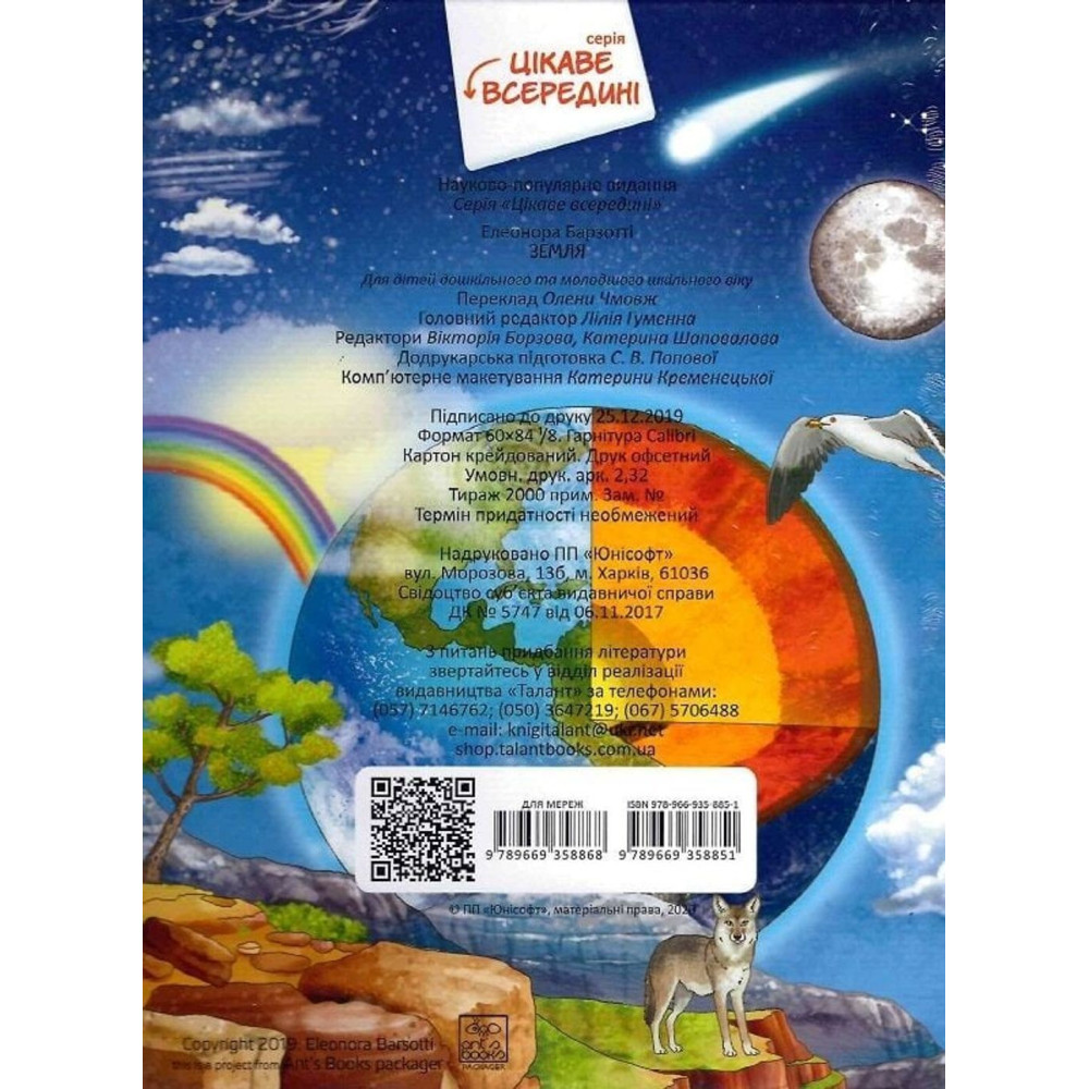 Енциклопедія «Земля» із серії «Цікаве всередині» розповість дітям про нашу чудову планету: як народжуються скелі-гриби, які скарби ховаються в надрах землі, як утворюються вулкани, чи велика міць торнадо та про інші дивовижі. Книга написана захопливо, стисло і водночас змістовно — має всі шанси стати улюбленою у вивченні природознавства.