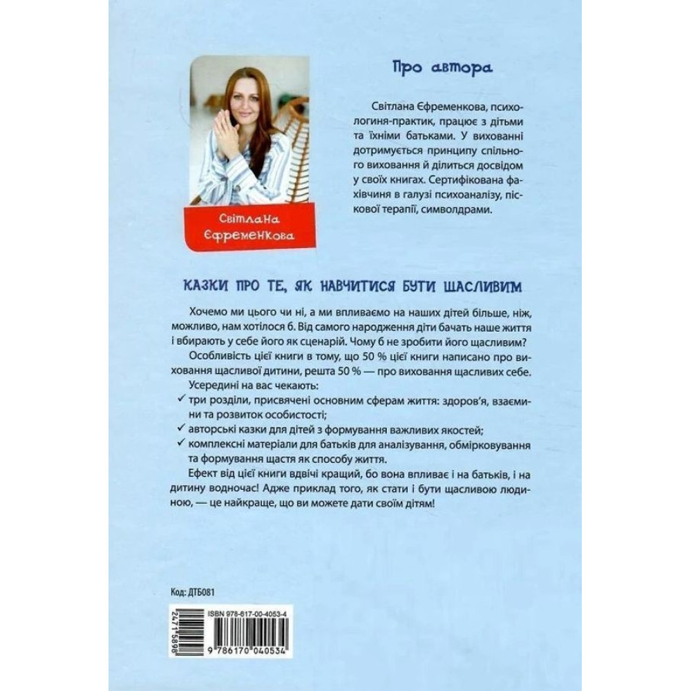 Особливість книжки Світлани Єфременкової «Казки про те, як навчитися бути щасливим, та поради дбайливим батькам» полягає в тому, що вона написана водночас і для батьків, і для дітей: