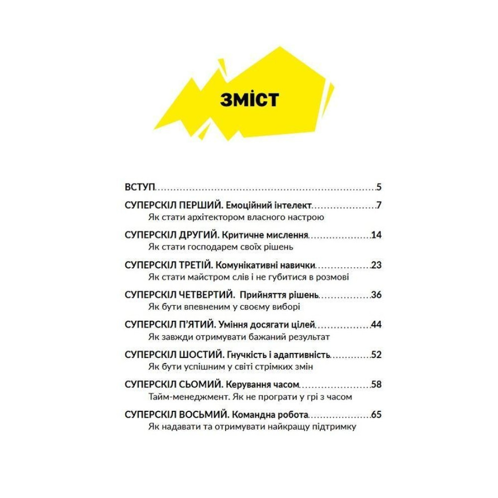 Авторка у доступній формі пояснює, як розвинути емоційний інтелект, критичне мислення, саморегуляцію, відповідальність, емпатію та стійкість до стресу. Кожен розділ присвячений одному «суперскілу» — важливій життєвій навичці, яку можна тренувати, як м’яз. У книзі є практичні вправи, тести, ситуаційні приклади та поради, що допомагають не лише зрозуміти себе, а й краще взаємодіяти з іншими.