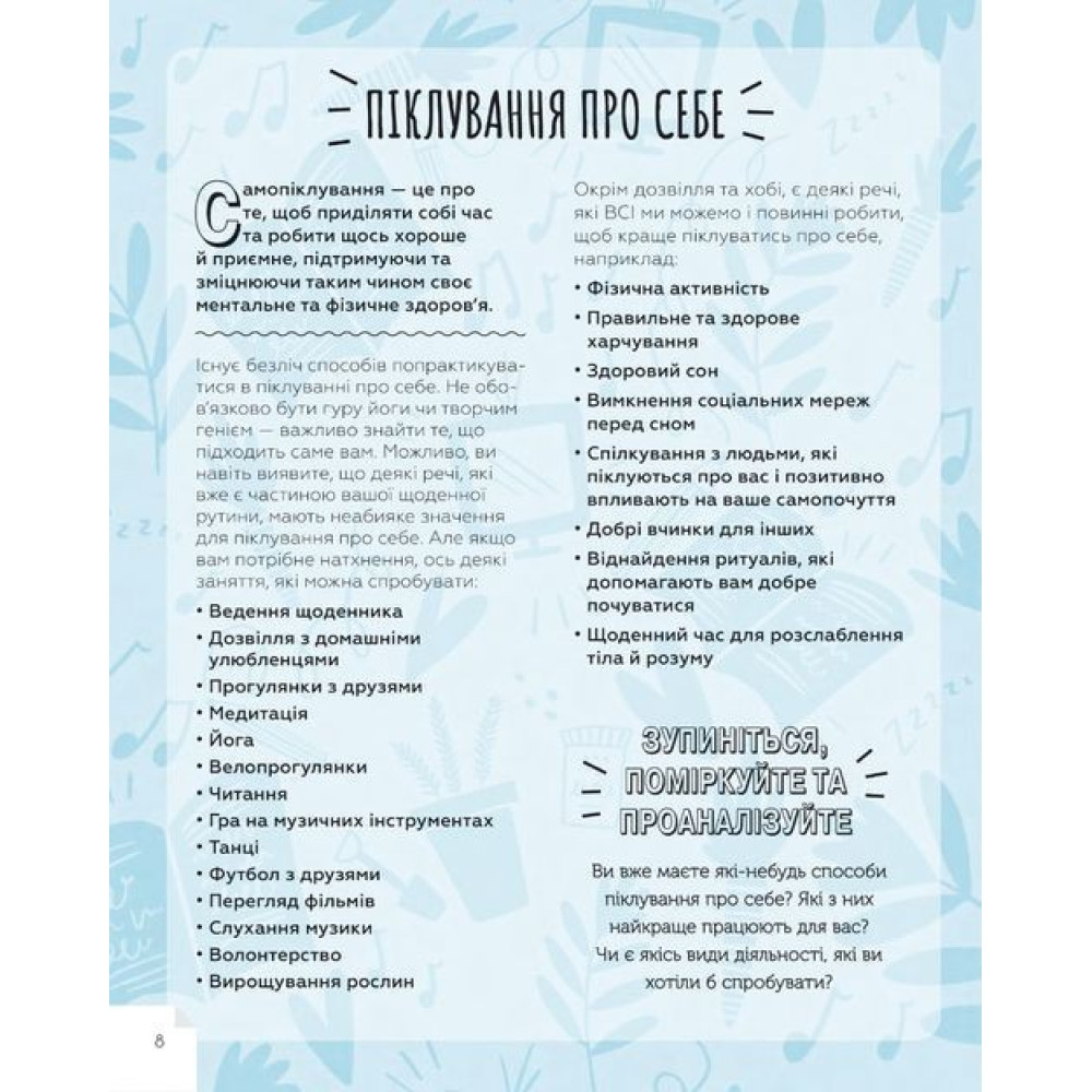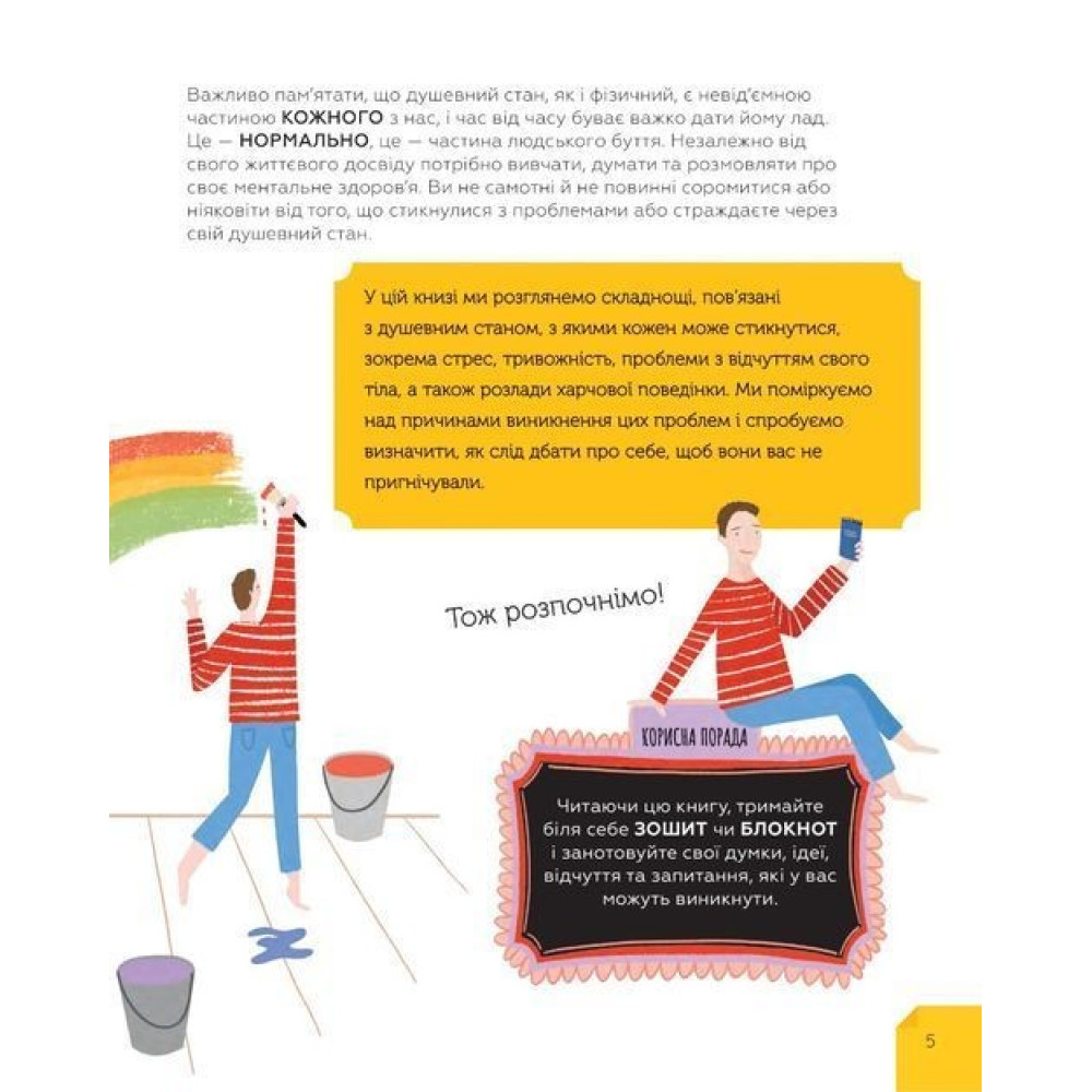 У цьому посібнику ви знайдете чимало дієвих ідей та практик, які допоможуть розпізнати поширені розлади, подолати нервовість та занепокоєння, вгамувати паніку, віднайти свої сильні сторони та емоційну рівновагу і як наслідок — почуватися здоровими та щасливими.