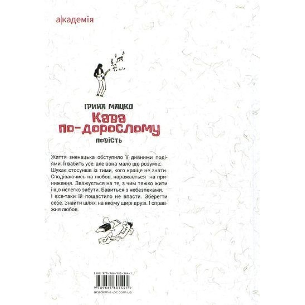 «Кава по-дорослому» — повість від Ірини Мацко, яка підіймає тему проблем підліткового віку та пошуку себе у цьому брудному світі.