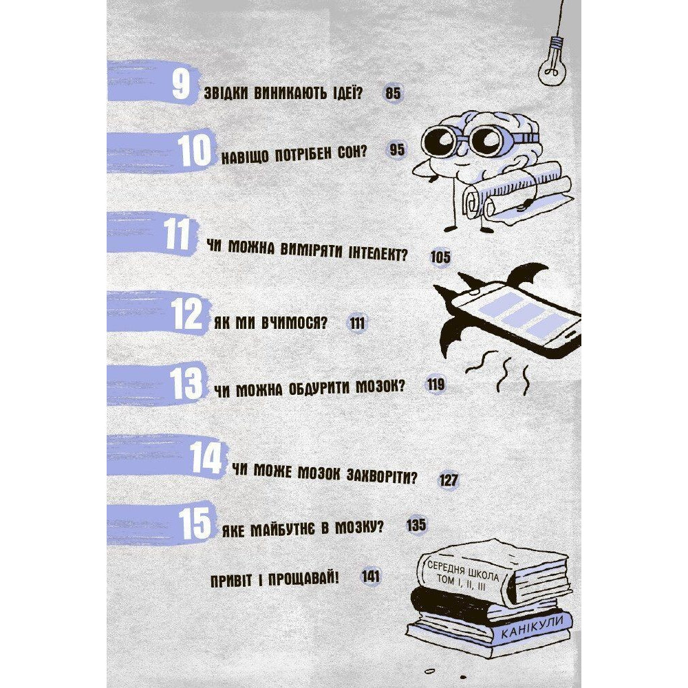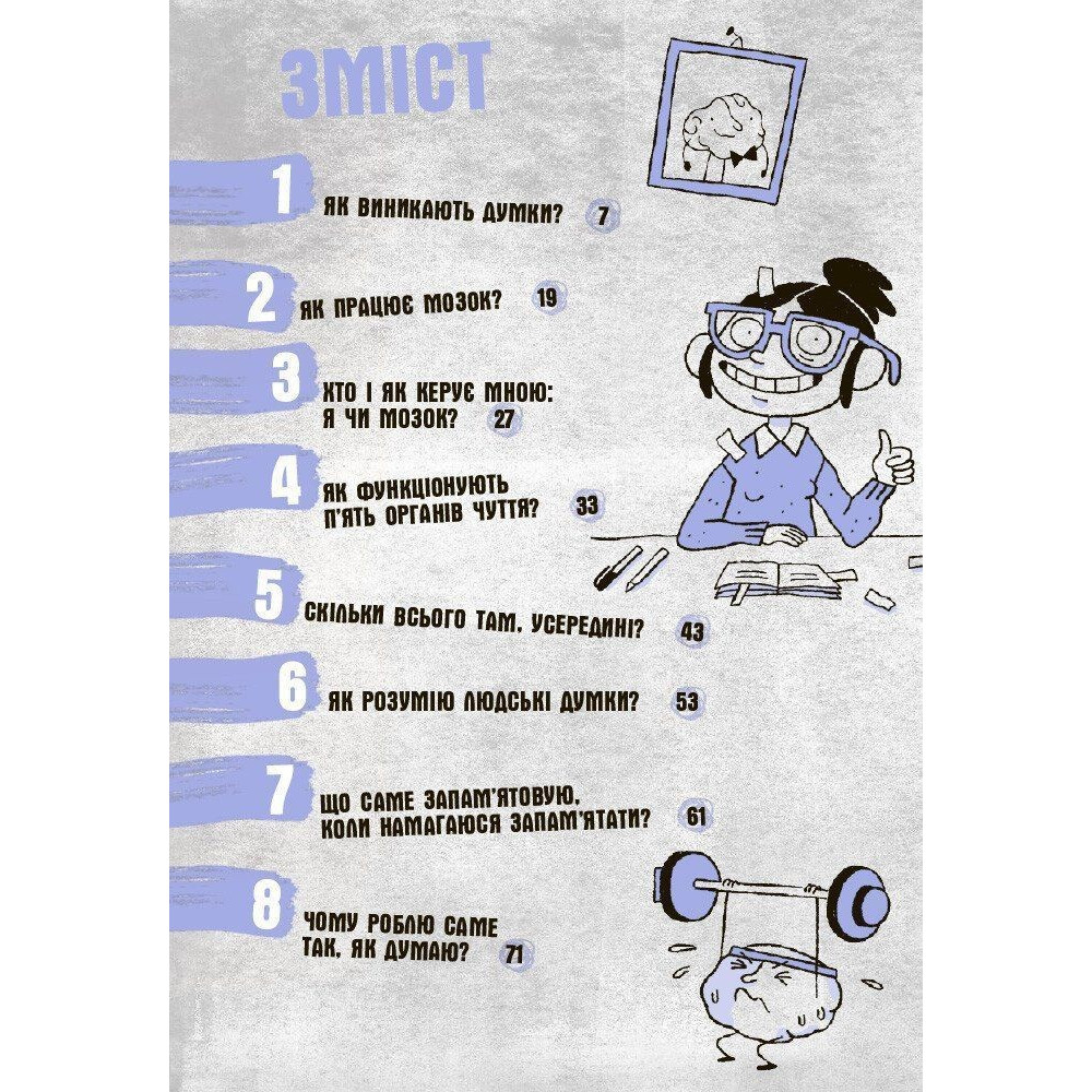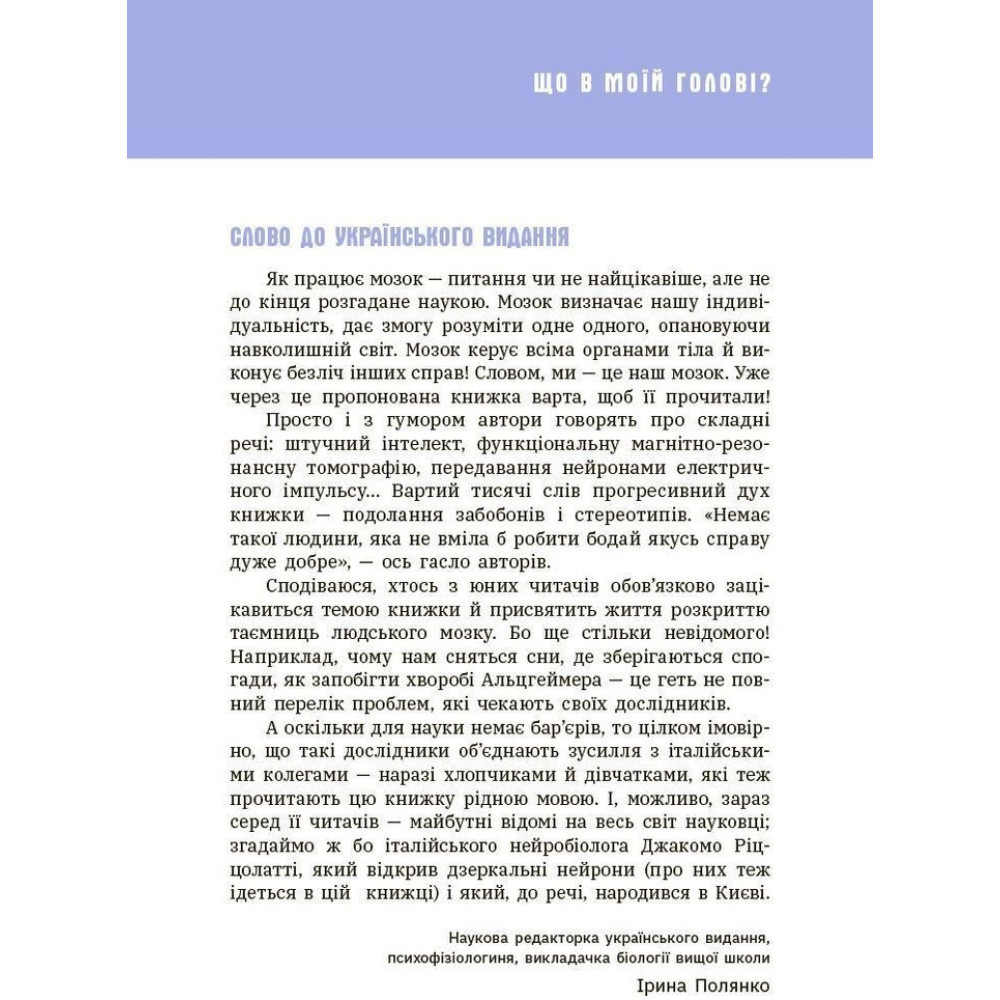 Просто і з гумором автори говорять про складні речі: штучний інтелект, функціональну магнітно-резонансну томографію, передавання нейронами електричних імпульсів… А ще читачам буде цікаво дізнатись: хто і як керує мною: я чи мозок? чи можна виміряти інтелект? чи можна обдурити мозок? навіщо потрібен сон та яка його важливість для мозку?