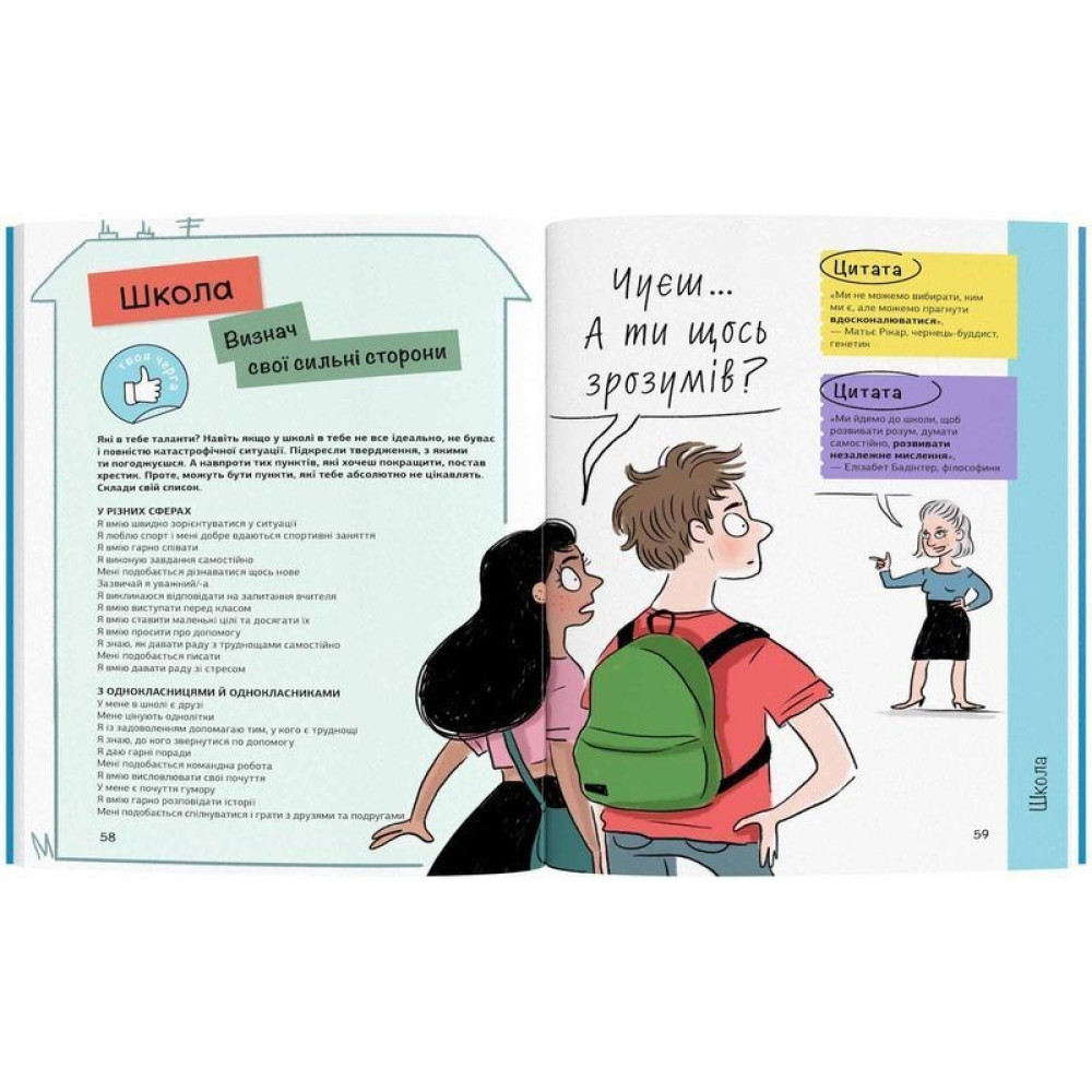 Книга допомагає зрозуміти, що нестача впевненості в собі турбує кожного і кожну, допомагає не зациклюватися на власних переживаннях, а подивитися на проблему ширше. Виразні і дотепні ілюстрації Ізабель Мароже допомагають донести основні думки книги, а часом й усміхнутися.