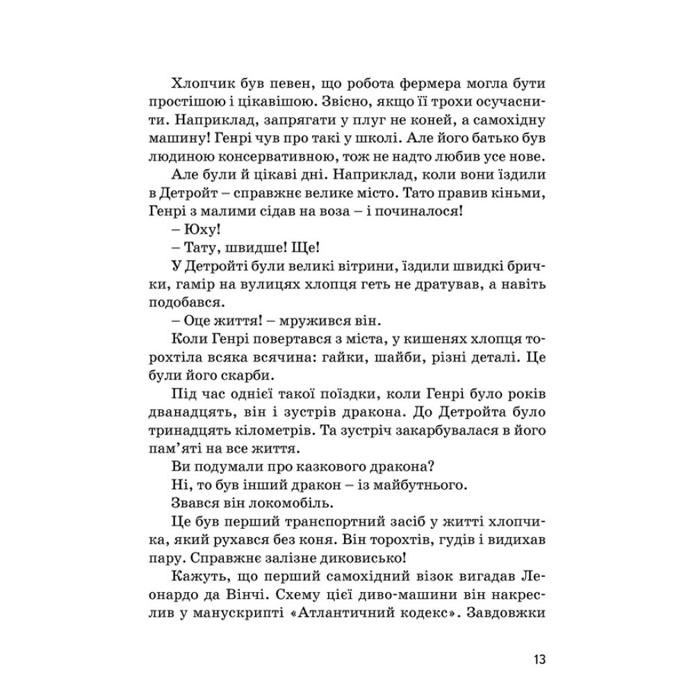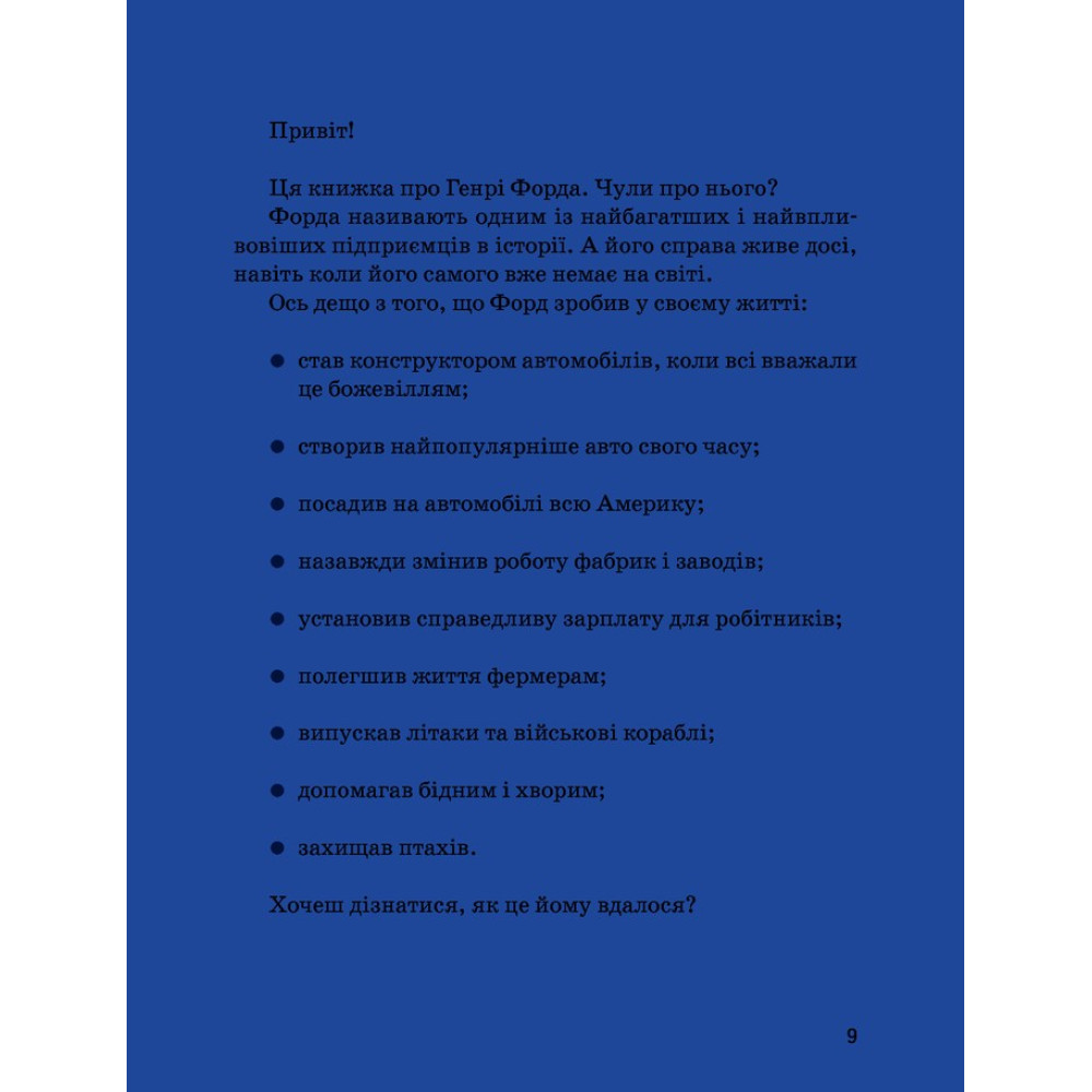 Однойменна книга-біографія про Генрі Форда за авторством Валентини Вздульської познайомить вас із людиною, яка знала, чого прагне та вміла за це боротися: Форд був цікавою, мужньою, сміливою особистістю. Він присвятив життя своїй пристрасті — створенню першокласних авто, які стали доступні для більшості, а наразі є всесвітньо відомим брендом під назвою Ford. Генрі Форд рішуче йшов до своїх цілей, адже ризикував, а як мав чергову невдачу — починав все спочатку і зрештою перемагав.