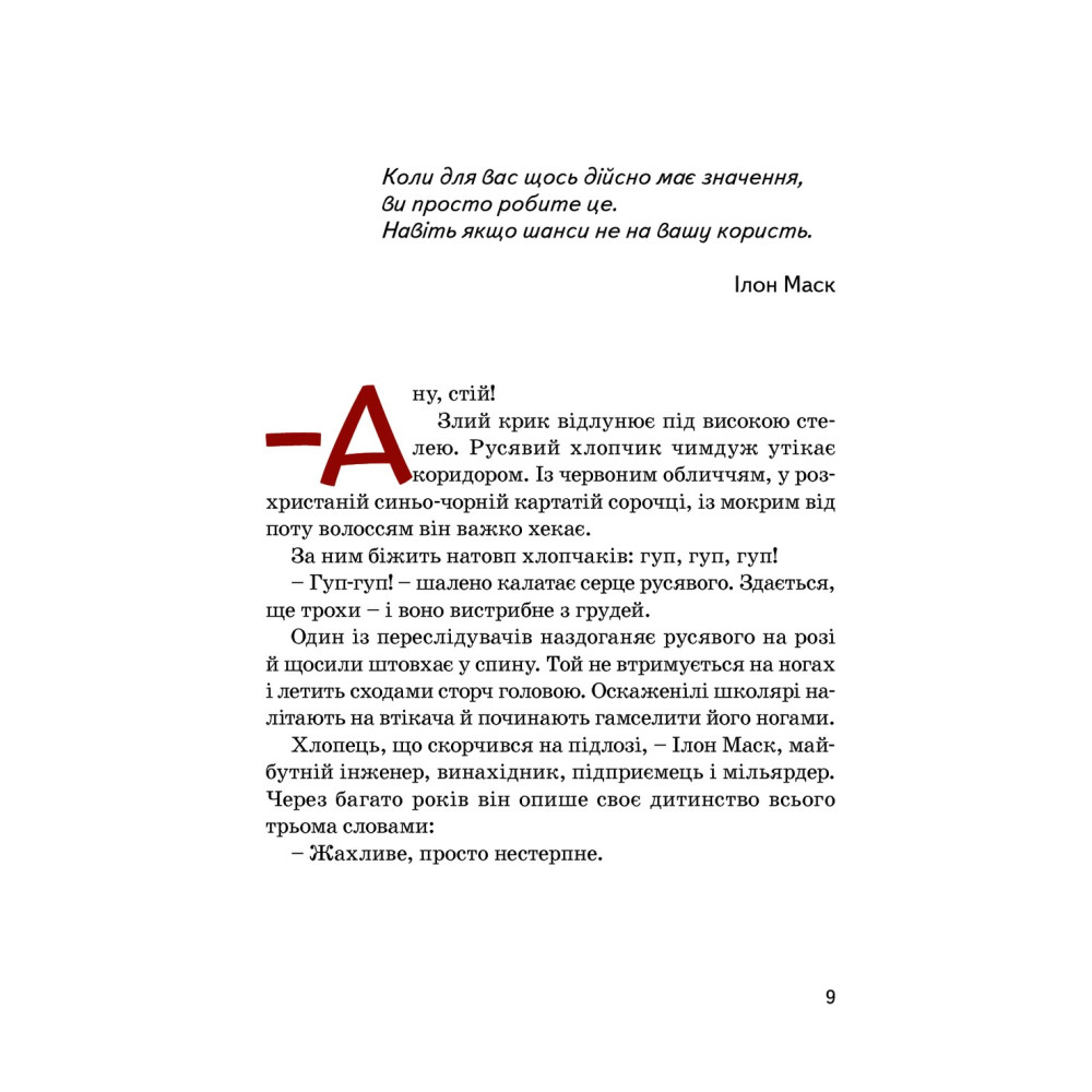 Однойменна книга-біографія Маші Сердюк розповідає історію життя Ілона Маска, мільярдера й винахідника, життя якого схоже більше на історію супергероя з голівудського фільму. Проте дитинство майбутнього генія розпочалося далеко за межами Голівуду: він народився в Південній Африці, батьки розлучились, однолітки ображали і били. Вже у той час Ілон Маск відчував, що народжений для чогось вагомого, визначного.