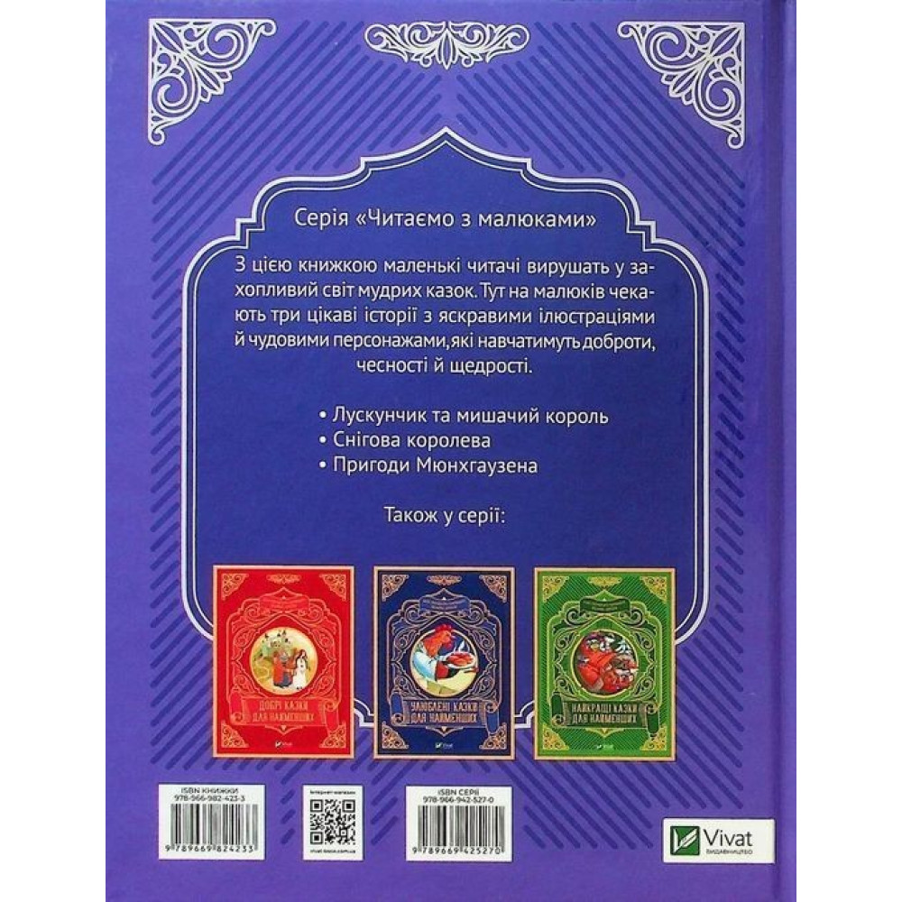 В книжці «Чарівні казки для найменших» від Олесі Супрун, Ірини Крамар та Наталії Кащак вас чекатимуть три культові казочки, які обгорнуті у сучасну форму — від «Пригод Мюнхгаузена» до «Снігової королеви» й «Лускунчика та мишачого короля».