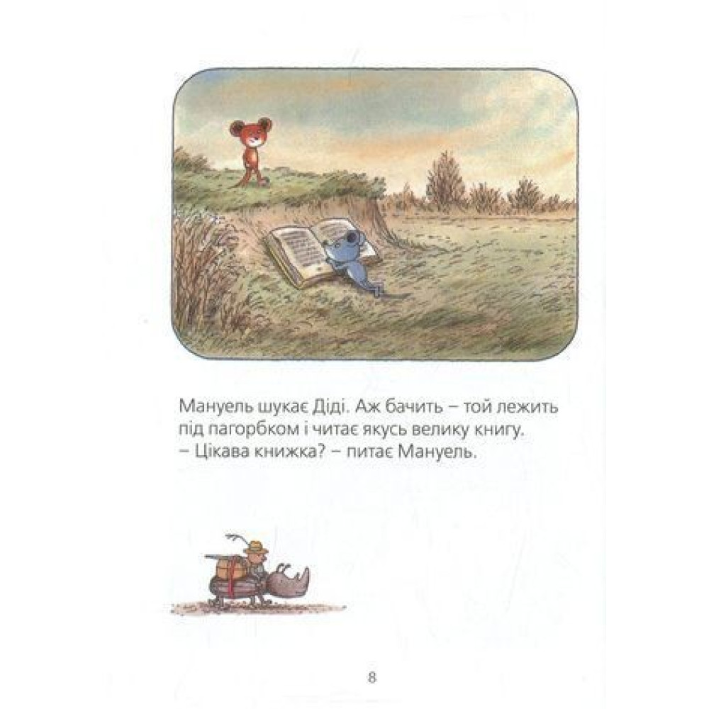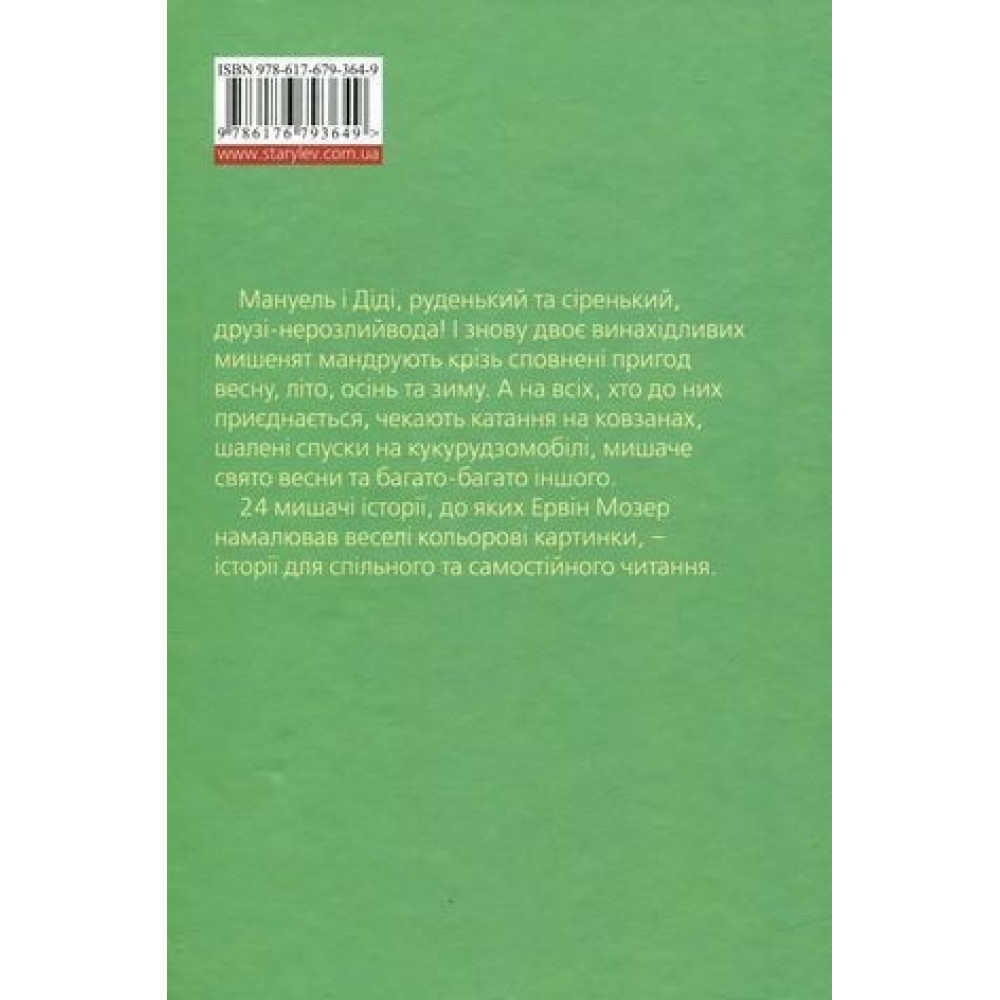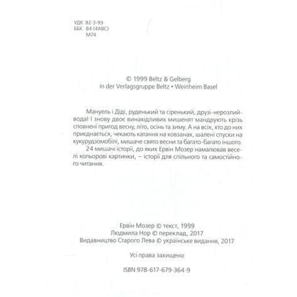 «Мануель і Діді. Книга друга» Ервіна Мозера містить історії для спільного та самостійного читання про мишенят Мануеля і Діді, руденького й сіренького, які є товаришами-нерозлий-вода! І знову двоє винахідливих мишенят мандрують крізь сповнені пригод весну, літо, осінь та зиму. А на всіх, хто до них приєднається, чекають катання на ковзанах, шалені спуски на кукурудзомобілі, мишаче свято весни та багато-багато іншого.