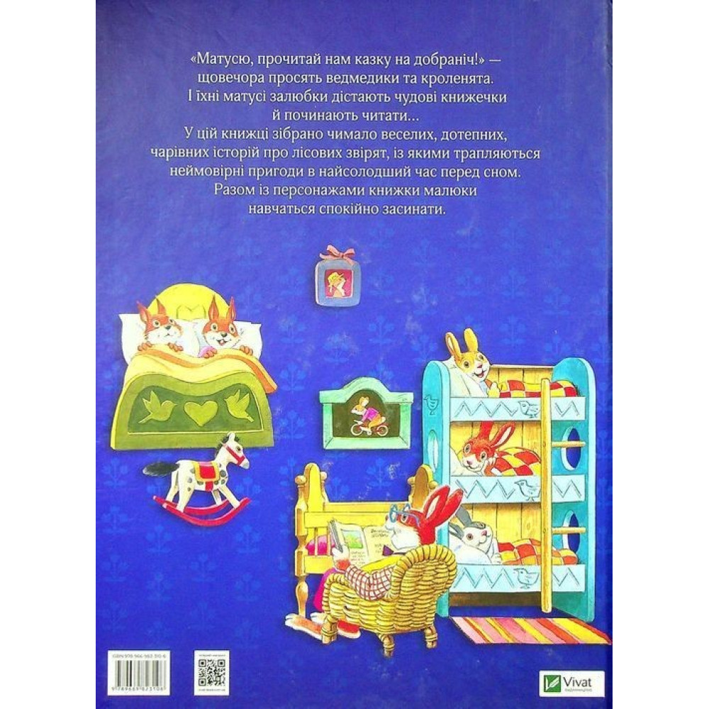 «Матусю, прочитай нам казку на добру ніч, хочеться, аби наснилося тільки щось гарне!», — щовечора просять ведмедики та кроленята своїх мамочок, то вони залюбки дістають чудові книжечки й починають читати їм перед сном, щоб вони тихесенько заснули й спали міцним сном.