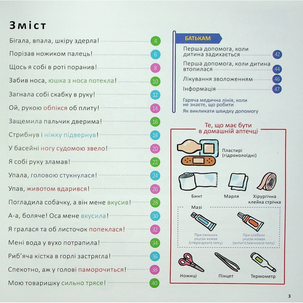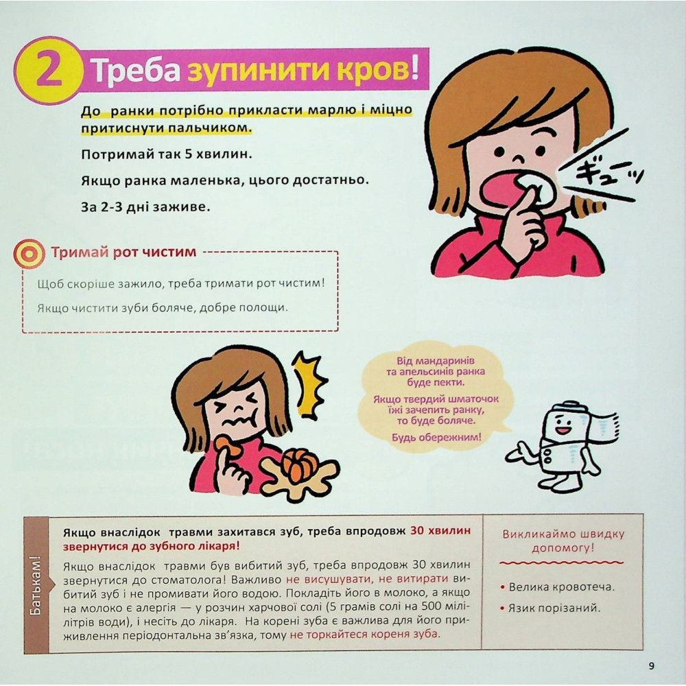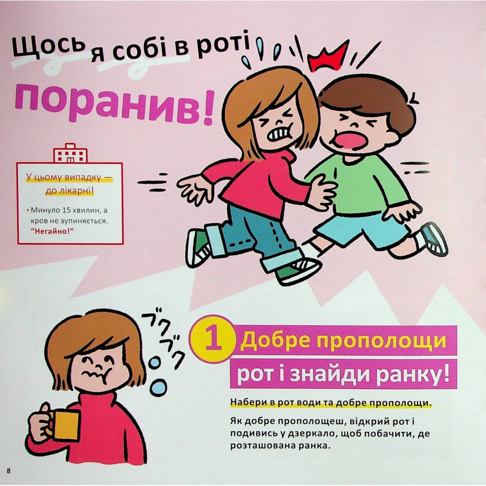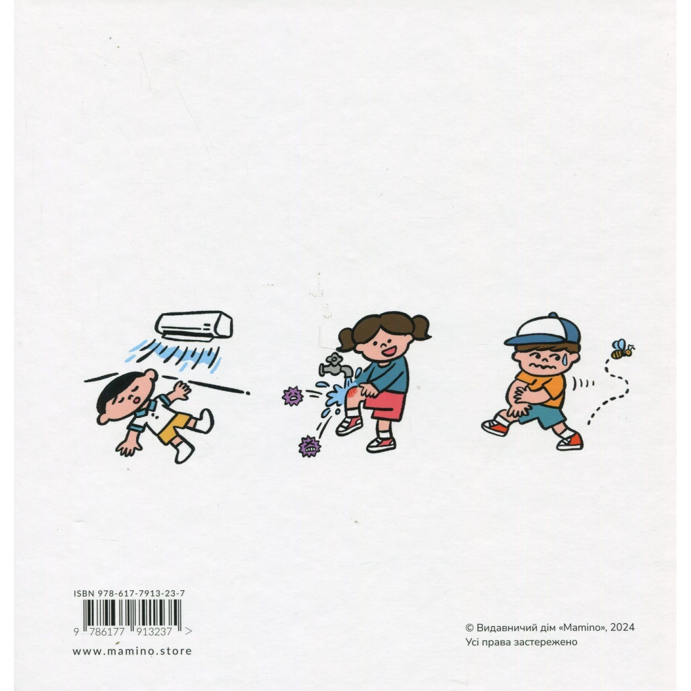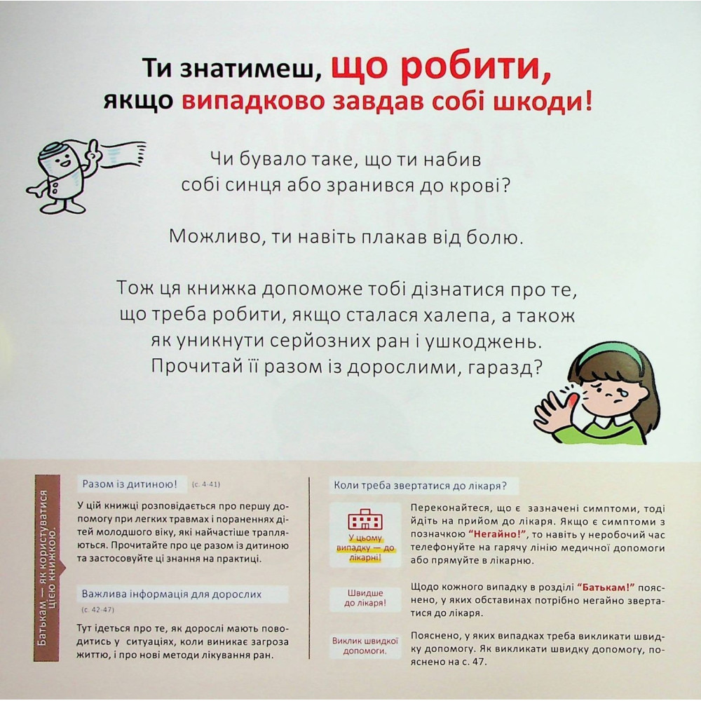Юний читачу, а чи бувало таке, що ти набив собі синця або зранився до крові? Можливо, ти навіть плакав від болю. Тож книжка Масахіко Сакамото під назвою «Швидка допомога для дітей. Що робити, коли поранився?» допоможе тобі дізнатися про те, що треба робити, якщо сталася халепа, а також як уникнути серйозних ран і ушкоджень. Прочитай її разом із дорослими, гаразд?
