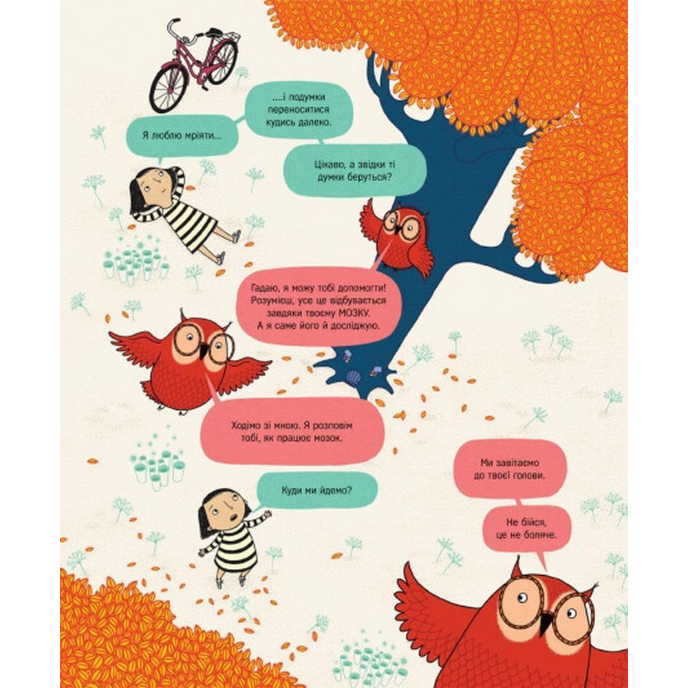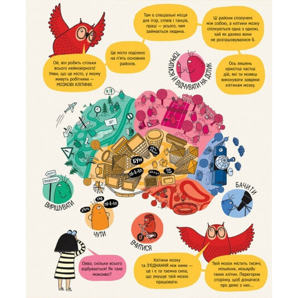 «Книжка про мозок і те, як він працює» від Бетіни Іп — це інтерактивна ілюстрована книга-мандрівка закапелками людського мозку, що призначена для допитливих читачів молодшого шкільного віку. Чи знаєте ви звідки беруться думки? Чи цікаво вам дізнатися, як ми вчимося щось робити, наприклад їздити на велосипеді, чи вивчати вірші напам’ять? Все це відбувається завдяки нашому мозку, який виконує стільки завдань, наче всередині є місто, повне людей та механізмів.