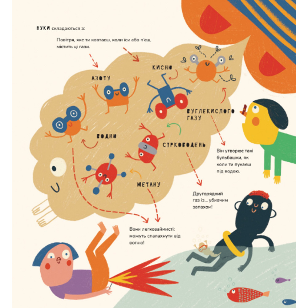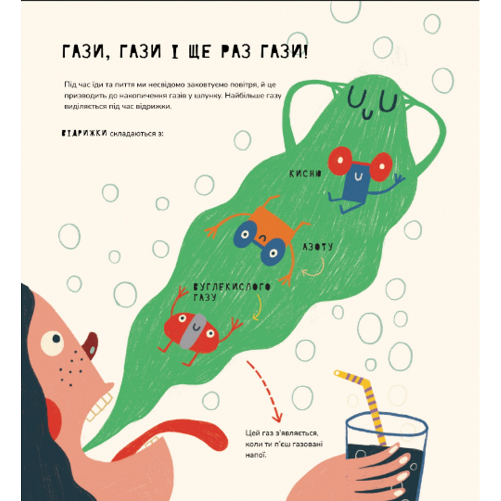 «Ой, я випадково!». Гази потрапляють усередину нашого тіла й виходять із нього щодня, іноді без дозволу… Але чому ми відригуємо й пукаємо? Дізнайтеся про це все у енциклопедії від Маріони Толоси Сістере — «Книжка про відрижки і пуки».