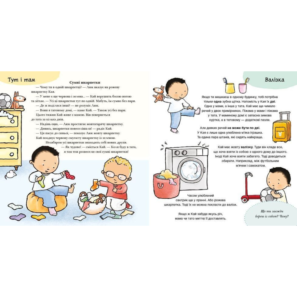 Якщо мама й тато більше не хочуть бути разом, де ти житимеш? Міка мешкає то з татом, то з мамою. Вона сумує за песиком Томмі, коли вона з мамою, і за котом Мурчиком — коли з татом. Йонас веде спеціальний записник, коли йде від тата до мами чи від мами до тата. А Лізі та Сенна стали зведеними сестрами. У розлученні батьків — чимало сумного, але є й дещо хороше: наприклад, можна двічі святкувати свій день народження!