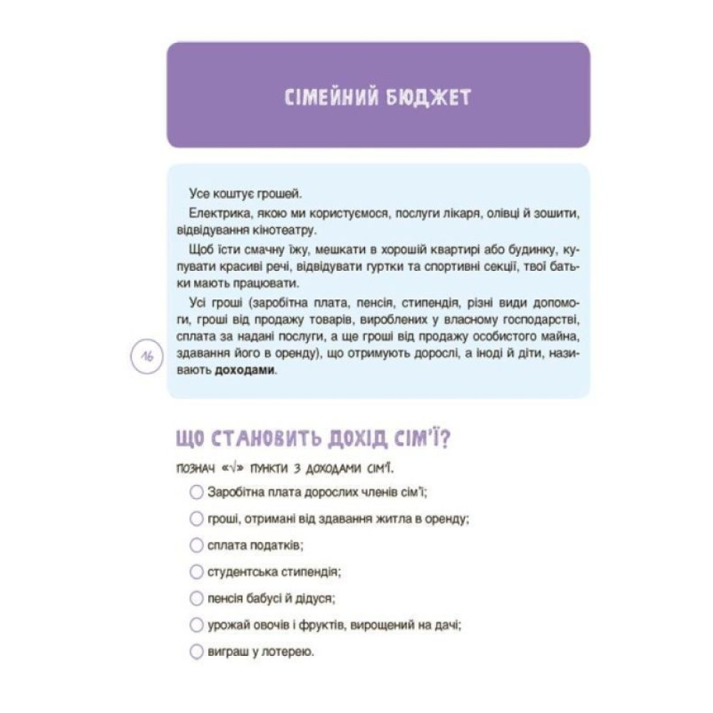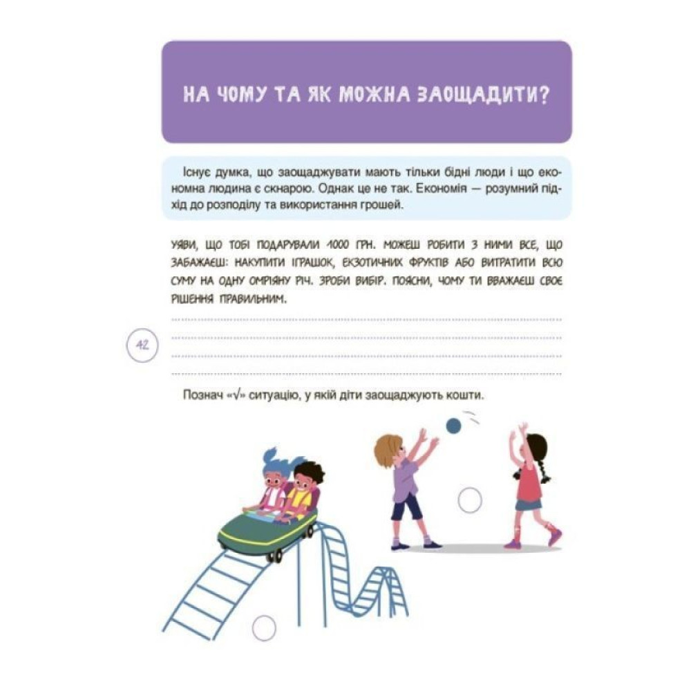 Цей зошит допоможе дітям 8-10 років отримати міцну основу для будування фундаменту фінансової грамотності. На сторінках їх чекають цікаві завдання та запитання для роздумів, які допоможуть навчитися наступним речам: