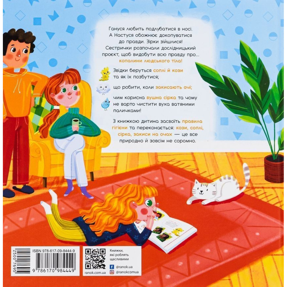 Ця дотепна та мудра книжка розповість про «копалини» людського тіла: соплі й кози з носа, закиси на очах та сірку у вухах. Чи корисні вони? І чи нормально, що вони з'являються в тілі? Як дотримуватися правил гігієни?