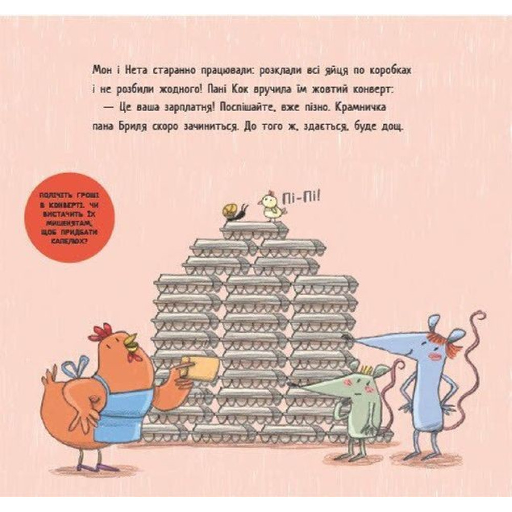 Ця інтерактивна книжка «Мон і Нета купують подарунок» від Монсе Хунієна та Люсії Серано просто та цікаво розповість малюкам про гроші. Діти зможуть взяти участь у пригодах головних героїв — мишенят Мона і Нети. Мишенята хочуть подарувати мамі на день народження солом’яний капелюшок, але з’ясовують, що для цього потрібні гроші.