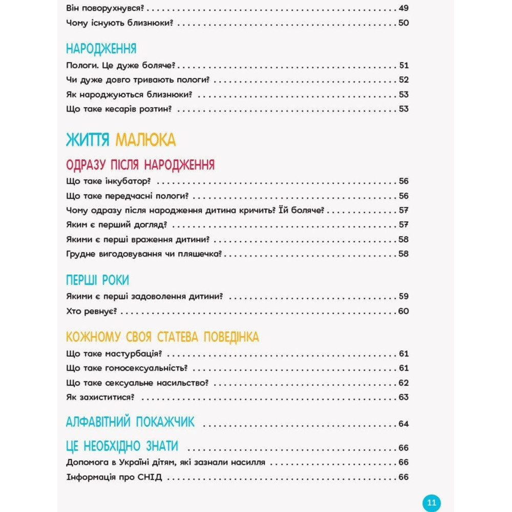 А ще багато інформації про перебіг вагітності, народження дитини, захист від насильства і інше необхідне. Уся інформація гарно проілюстрована, аби полегшити підліткам її розуміння.