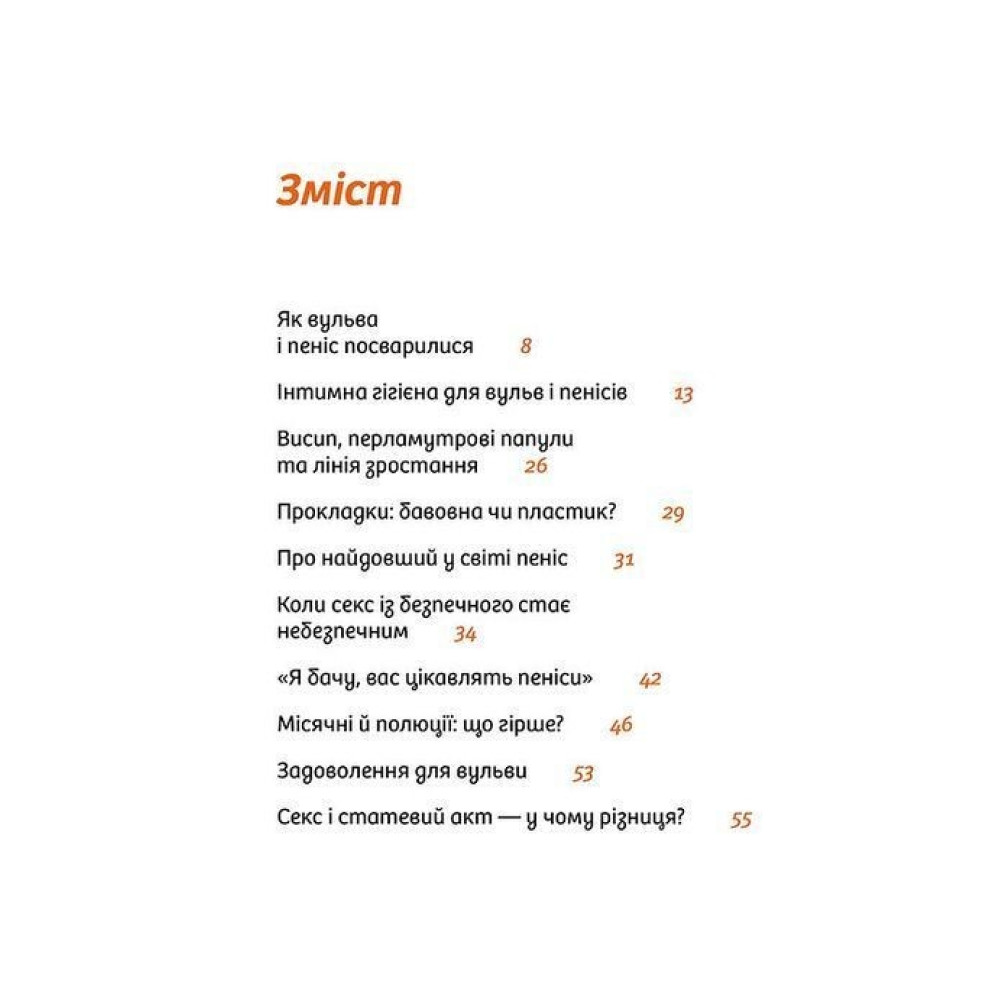 Ця книжка відповідає на найпоширеніші й найделікатніші запитання, які часто соромно поставити вголос: про гігієну, ерекцію, лубриканти й презервативи, різницю між сексом і статевим актом, порнографію, згоду та способи захисту. Авторка простою мовою пояснює, як піклуватися про своє тіло, поважати межі іншого та зберігати безпеку у близьких стосунках.