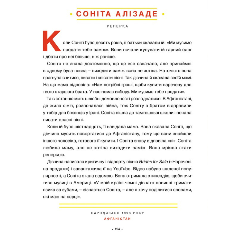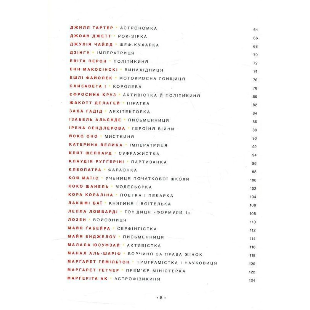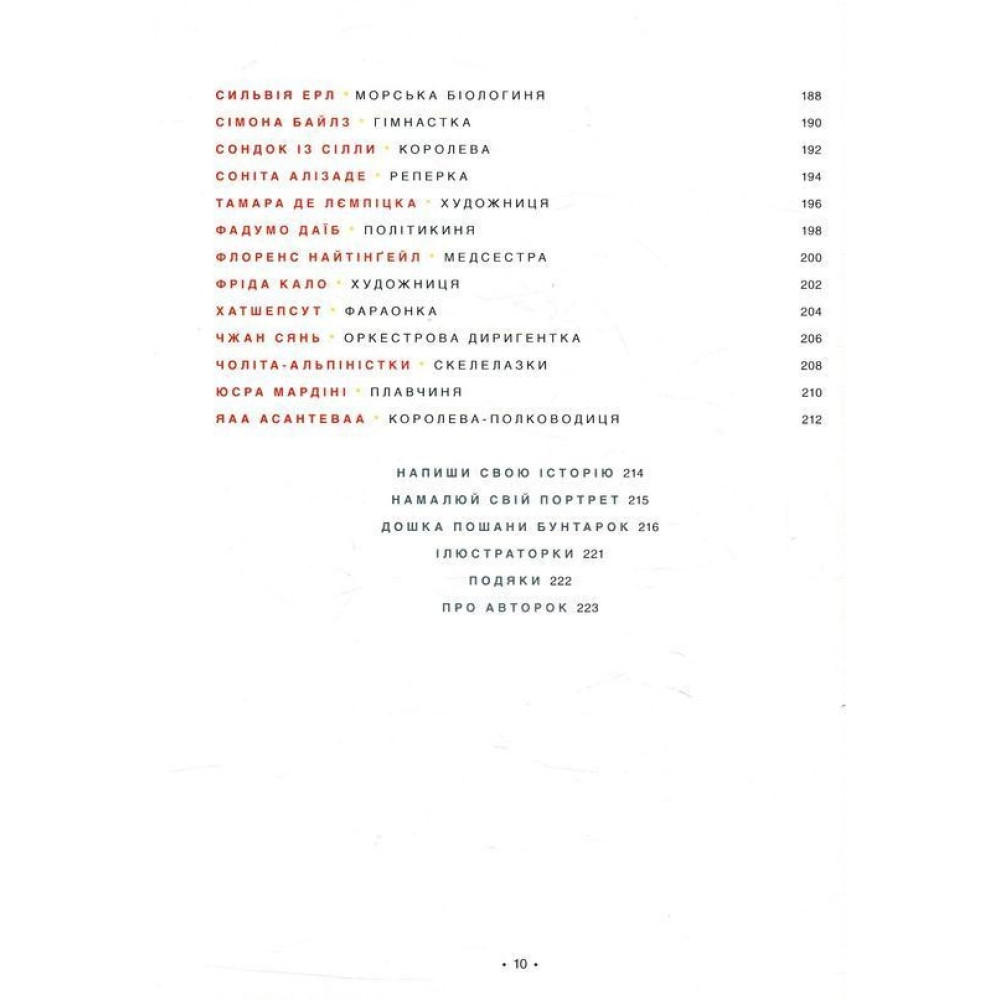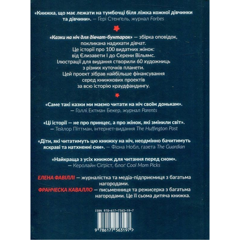 Збірка «Казки на ніч для дівчат-бунтарок» від Франчески Кавалло та Елени Фавіллі не лише надихне дівчаток-читачок, але й продемонструє, що жодне із досягнень не давалося героїням просто. Соціальний скепсис та агресія, історичні події, патріархальні родинні традиції — усі ці фактори ускладнювали шлях героїнь.