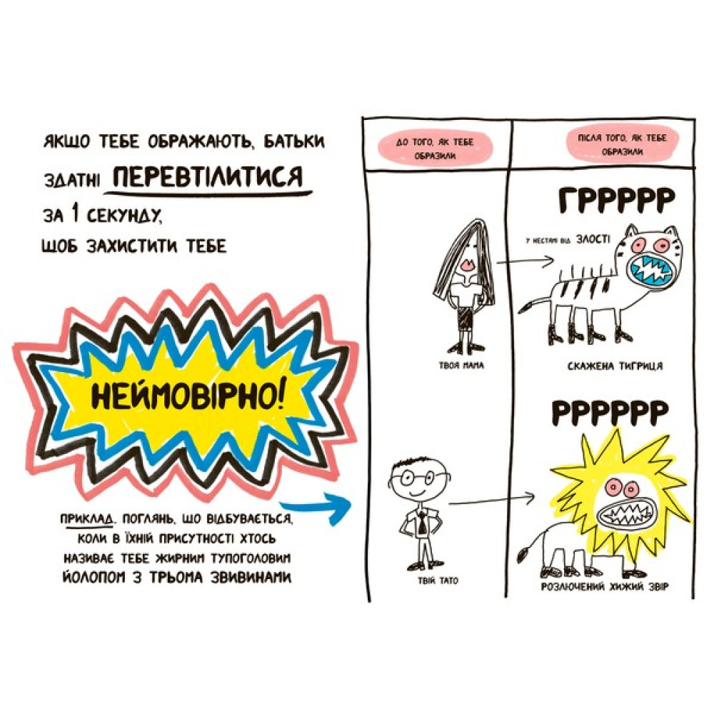 У ній немає нудних моралей чи довгих лекцій — замість цього читача чекають вибухові кольорові ілюстрації, кумедні діалоги й абсолютно чесні відповіді на найпопулярніші запитання.