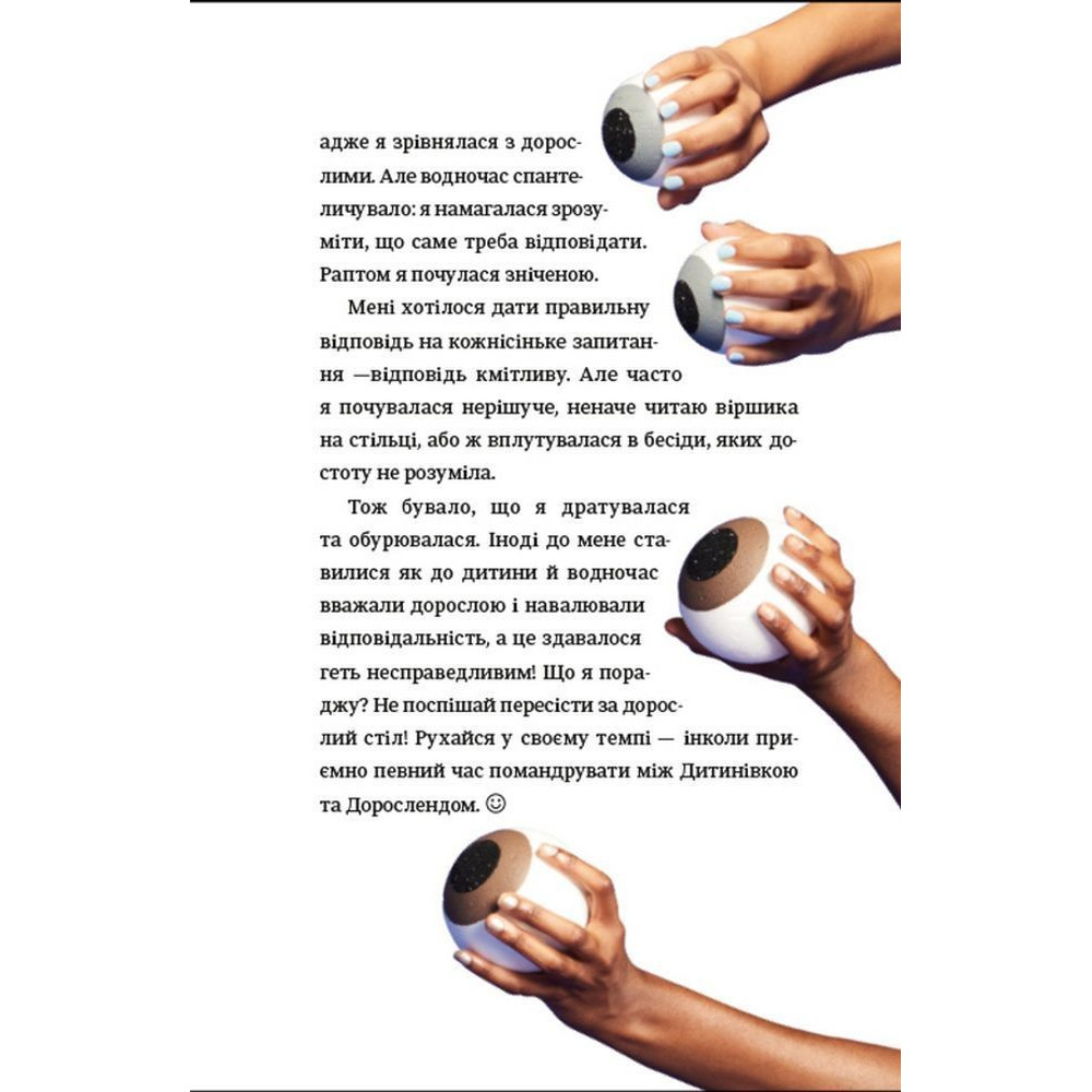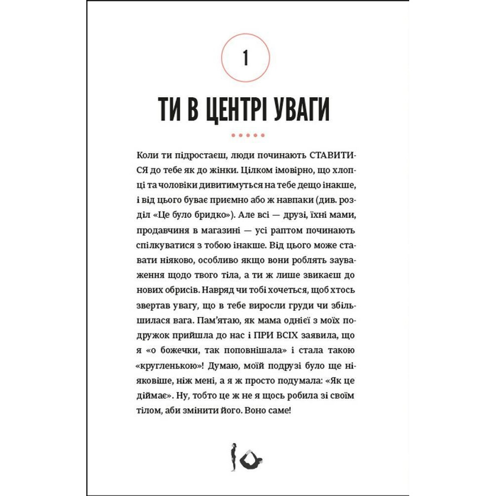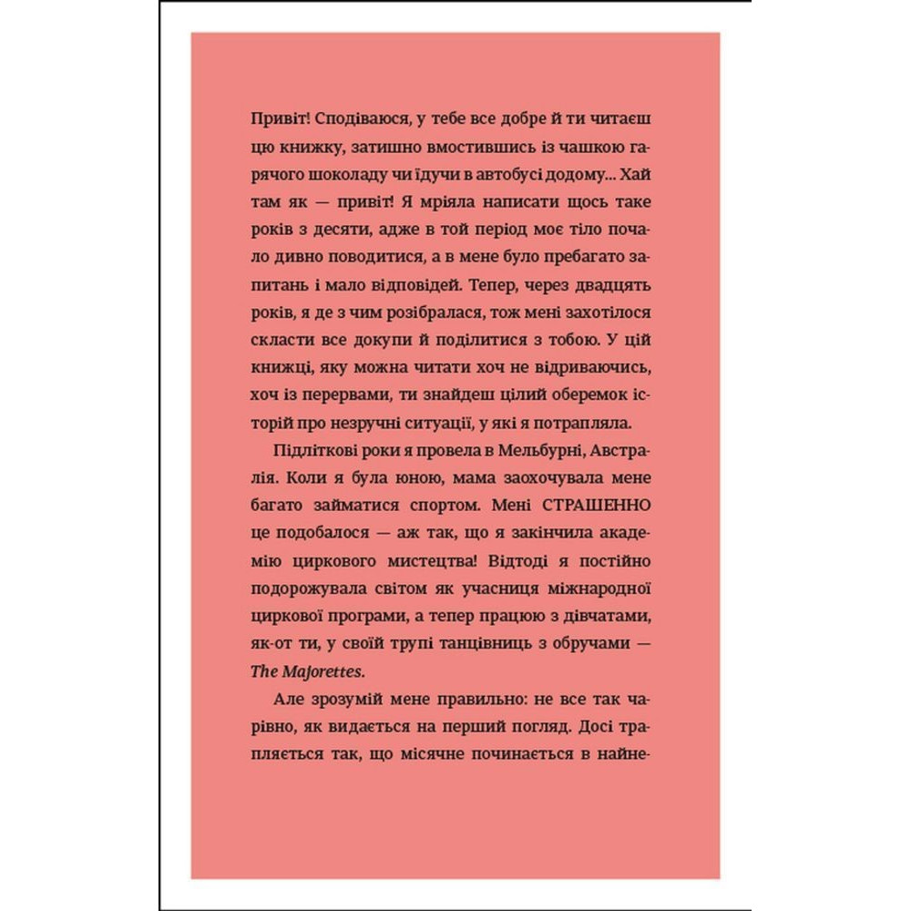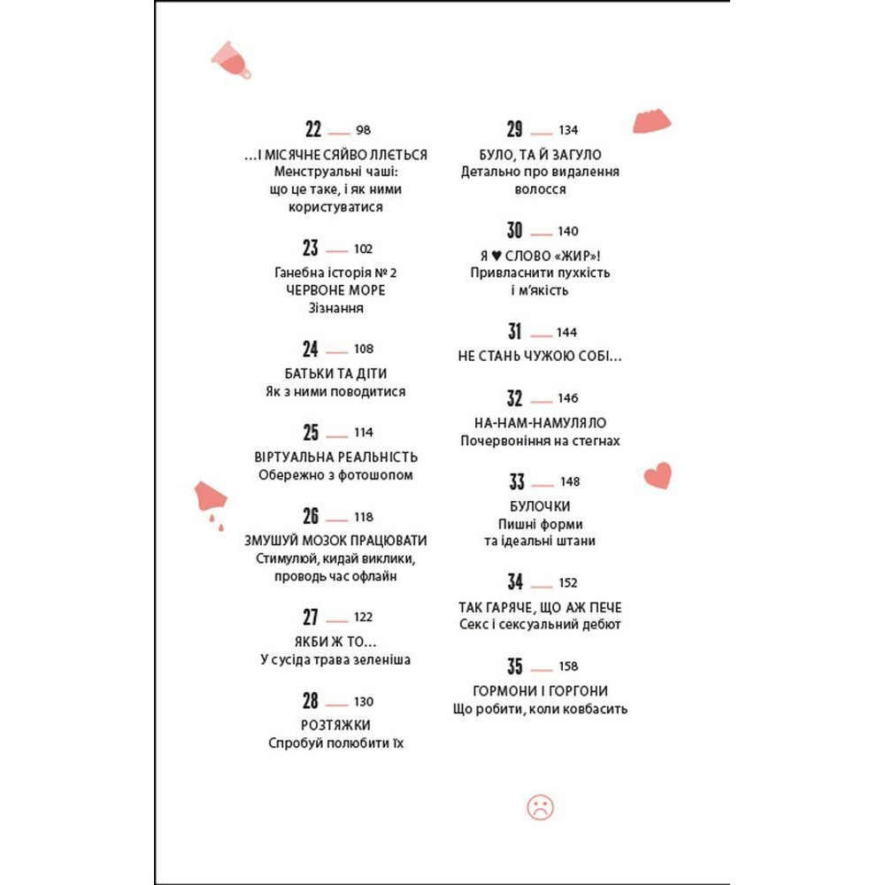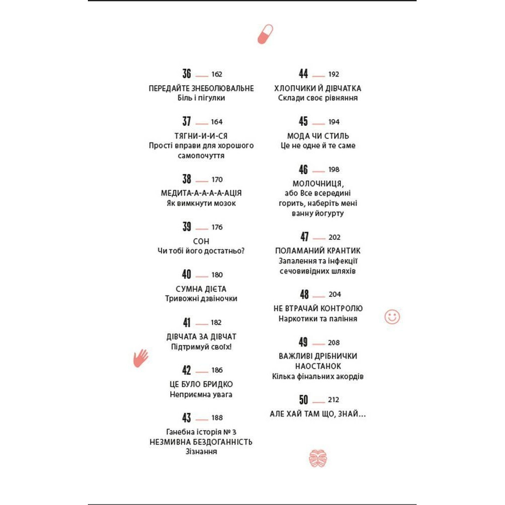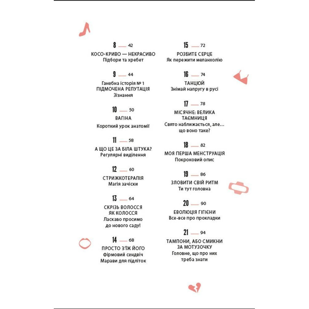 Зокрема тут можна прочитати про те, як обрати перший бюстальгер, що варто знати про перші місячні, як доглядати за шкірою обличчя, як дати раду з надмірним потовиділенням, що робити, коли доводиться носити брекети, а ще як харчуватись, як рухатись, скільки спати, про особисту гігієну, а ще про стосунки батьками у цей період, стосунки з друзями, як проявляти свої почуття і переживати, коли хтоcь не відповідає взаємністю, про гормони та емоційний інтелект і як з гумором ставитись до неприємностей, які зі всіма трапляються.