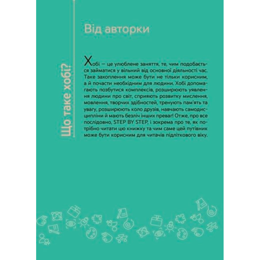 Легкі вправи та завдання наприкінці книжки допоможуть остаточно визначитися з хобі та підготуватися до опанування обраного заняття.