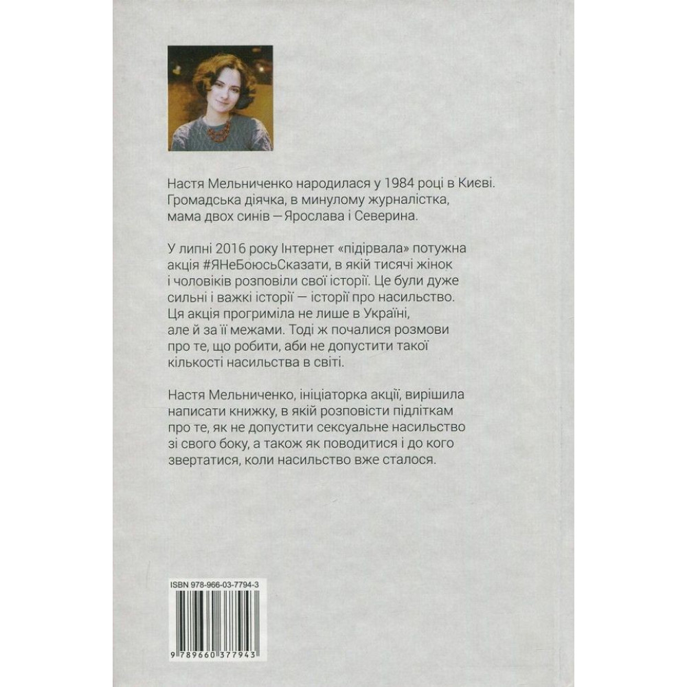 На сторінках книжки «#ЯНеБоюсьСказати: Найвідвертіша книжка для підлітків» Настя Мельниченко, ініціаторка відомої акції #ЯНеБоюсьСказати, у доступній манері пояснює підліткам про недопустимість насильства у свій бік, чи то психологічного, чи то фізичного або сексуального — а також боротьбі із його наслідками.