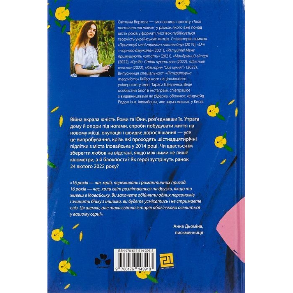 «Юна. Війна» Світлани Вертоли — це захоплива та зворушлива книга, що розповідає про життя двох молодих людей, Юни та Роми, які опиняються в самому серці війни в Україні. Письменниця вдається до унікального прийому, розповідаючи історію через перспективу обох героїв, дозволяючи нам зрозуміти їхні думки, емоції та переживання.