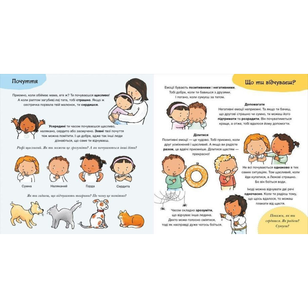 «Що ти відчуваєш? Книжка про емоції» за авторством Пауліни Ауд — це перша книжечка вашого малюка про емоції та почуття. Вона допоможе йому розпізнати емоції за виразом обличчя і визначати почуття героїв кожного сюжету.