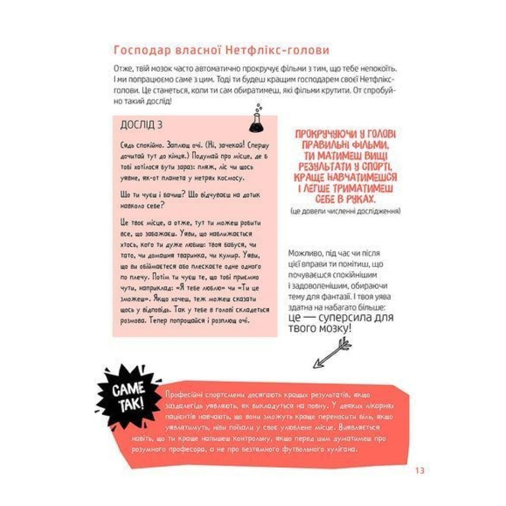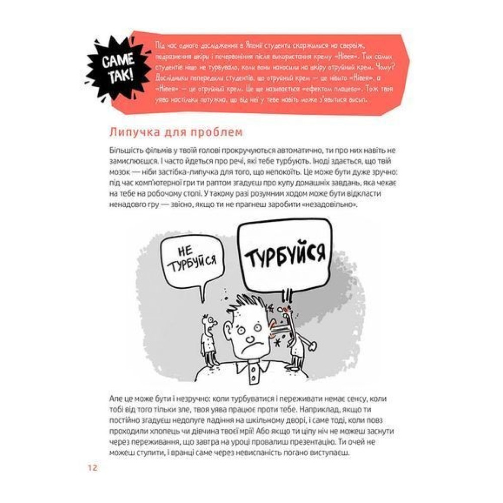 Якщо твоє життя — це комп’ютерна гра, то голова — її контрóлер. І так само, як у комп’ютерній грі, у справжньому житті теж є складні рівні: нарікання батьків, сварка з хорошим другом, перший день у середній школі, думка, що ти невдаха, чи зізнання комусь, що ти її або його кохаєш. Але хай яким складним буде рівень у твоєму житті, якщо користуватися контролером правильно, ти впораєшся з усім! Відкрий свої 15 суперсил, і тренуй їх за допомогою цієї книжки.