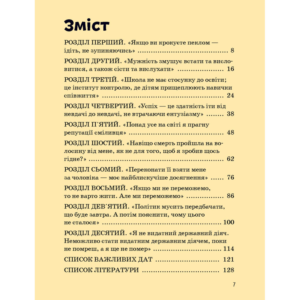 Книга-біографія «Вінстон Черчилль» Ірини Костюченко розповідає про видатного британського політика й героя нації, який з самого дитинства був сильним та сміливим: малюк не дуже любив навчання у школі, за що його часто карали вчителі, проте у молоді роки майбутній політик встиг чимало повоювати, дослужившись в підсумку до чину полковника. Черчилль брав участь у бойових діях в Європі, Південній Америці, Азії та Африці. Він навіть потрапив за грати через військовий стан. Вінстон завжди мріяв бути генералом, але доля приготувала юнаку дещо інше.