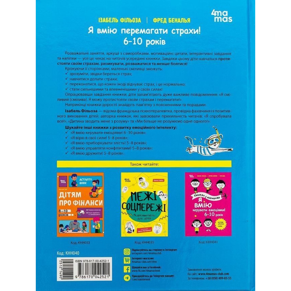 Розважальні заняття, аркуші з саморобками, мотиваційні цитати, інтерактивні завдання та наліпки — усе це чекає на читачів усередині книжки «Я вмію перемагати страхи! 6-10 років», яку створили Ізабель Фільоза й Фред Беналья. Завдяки цьому діти навчаться протистояти своїм страхам, ризикувати, розважатися та менше боятися!