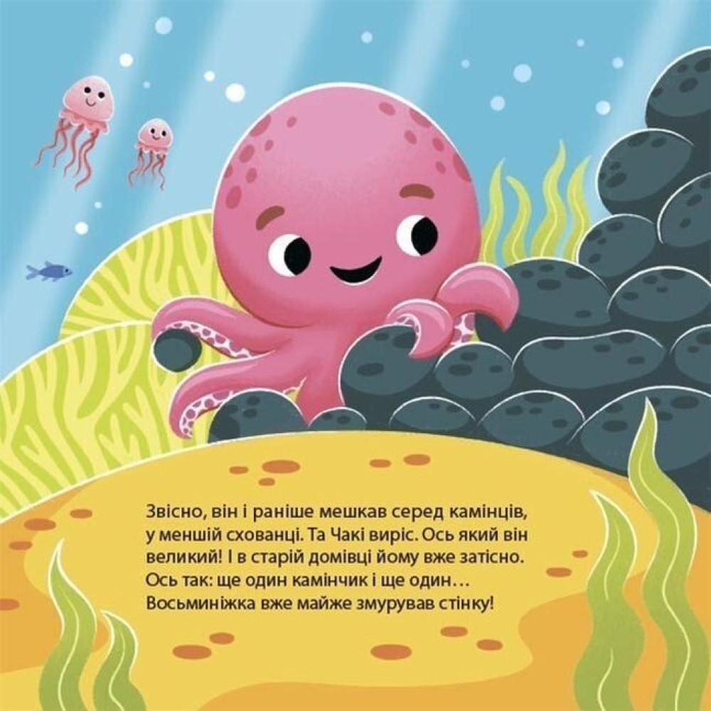 Головний герой книжки «Як восьминіжка Чакі злився» переживає різні емоції. Він радіє, сумує, злиться, дивується, боїться. Знайомиться зі своїми почуттями й намагається керувати ними. Разом із Чакі маленькі читачі також дізнаватимуться про різні емоції та вчитимуться приймати їх і давати собі раду.