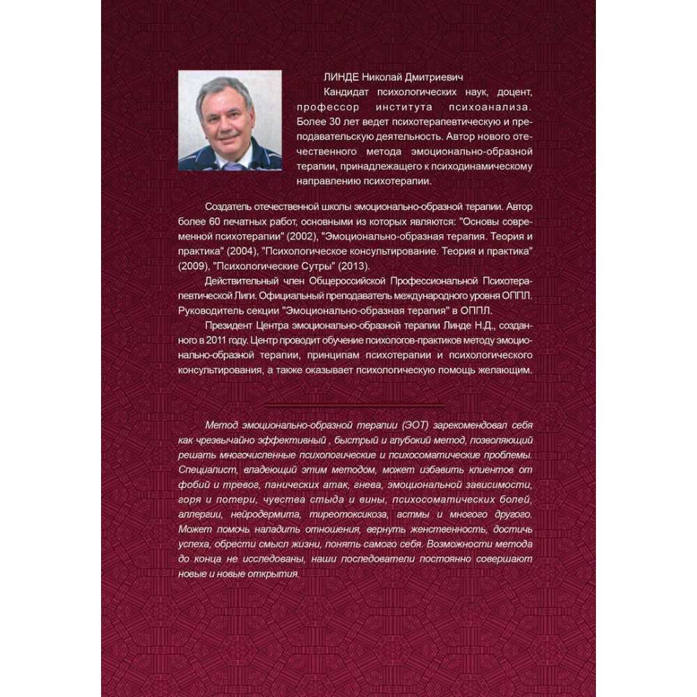 Николай Дмитриевич Линде – кандидат психологических наук и доцент, профессор института психоанализа, автор метода «Эмоционально-образной терапии», президент Центра ЭВТ Линде М.Д.