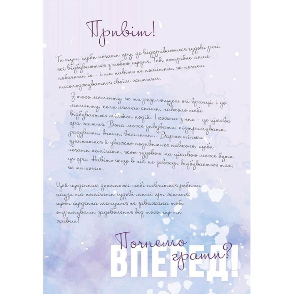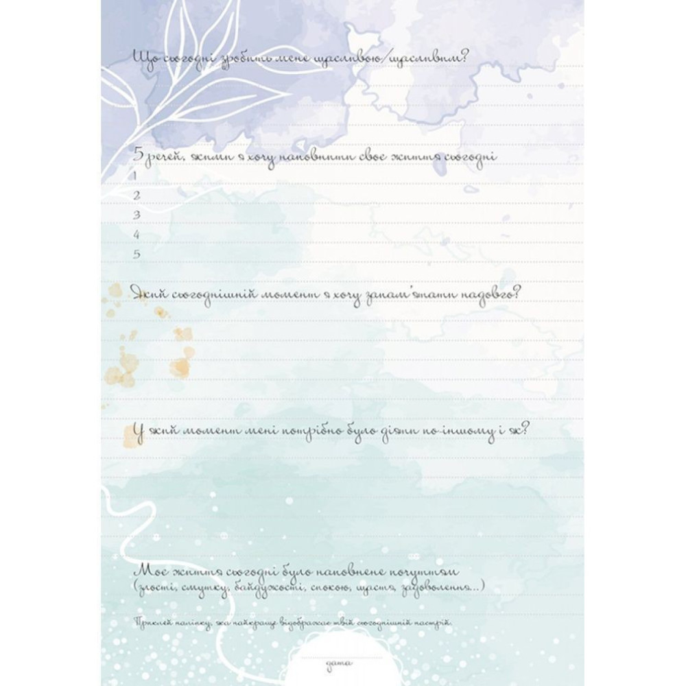 Дневник научит обращать внимание на такие жизненные мелочи и чувствовать их — вопреки ужасам, стрессам, суете, ответственности за все и за всех, достижению целей и бытовым заботам, чтобы просто жить по-свободному.