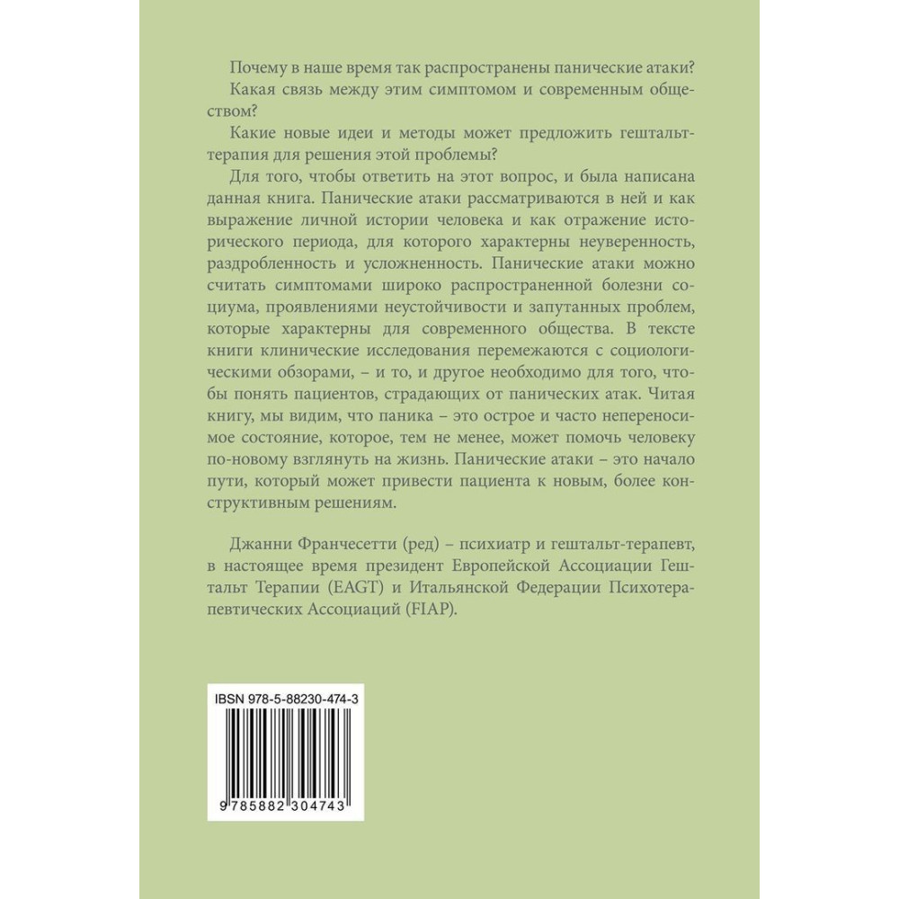 Для того чтобы ответить на этот вопрос, и была написана книга «Панические атаки. Гештальт-терапия в единстве клинических и социальных контекстов», выпущенная под редакцией Джанни Франчесетти, Маргериты Спаниоло Лобб и Джованни Салониа. Панические атаки рассматриваются в ней и как выражение личной истории человека, и как отражение исторического периода, для которого характерны неуверенность, раздробленность и усложненность.