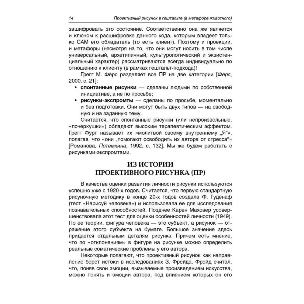 Виолетта В. Минина, автор книги «Проективный рисунок в гештальте (в метафоре животного)», убеждена, что рисунок является самым быстрым, безопасным и коротким путем в глубины человеческого подсознания. Он отражает надежды и переживания – от актуальных проблем до сокровенных тайн души. Разговор через рисунок – это ключ к безболезненному выходу из наиболее кризисных ситуаций, пониманию другого, объединению отдельных частей собственной личности.