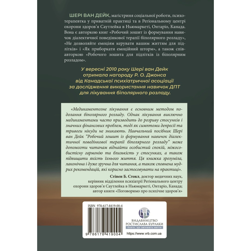 Шери ван Дейк — магистр социальной работы, психотерапевт в частной практике и в Региональном центре здравоохранения Саутлейка в Ньюмаркете, Онтарио, Канада. Она является автором книг «Рабочая тетрадь по формированию навыков диалектической поведенческой терапии биполярного расстройства», «Не позволяйте эмоциям управлять вашей жизнью для подростков» и «Как обуздать эмоциональный шторм», а также соавтором «Рабочей тетради для подростков из биполярного расстройства». В сентябре 2010 г. она получила награда Р. А. Джонса от Канадской психиатрической ассоциации за исследование использования навыков ДПТ для лечения биполярного расстройства.