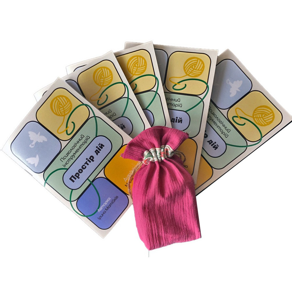 Психологический инструментарий «Пространство действий» по авторству Ирины Матийков содержит одноименное бревно карт с парами глаголов (80 шт.) и руководство с примерами более 20 упражнений (32 стр.).