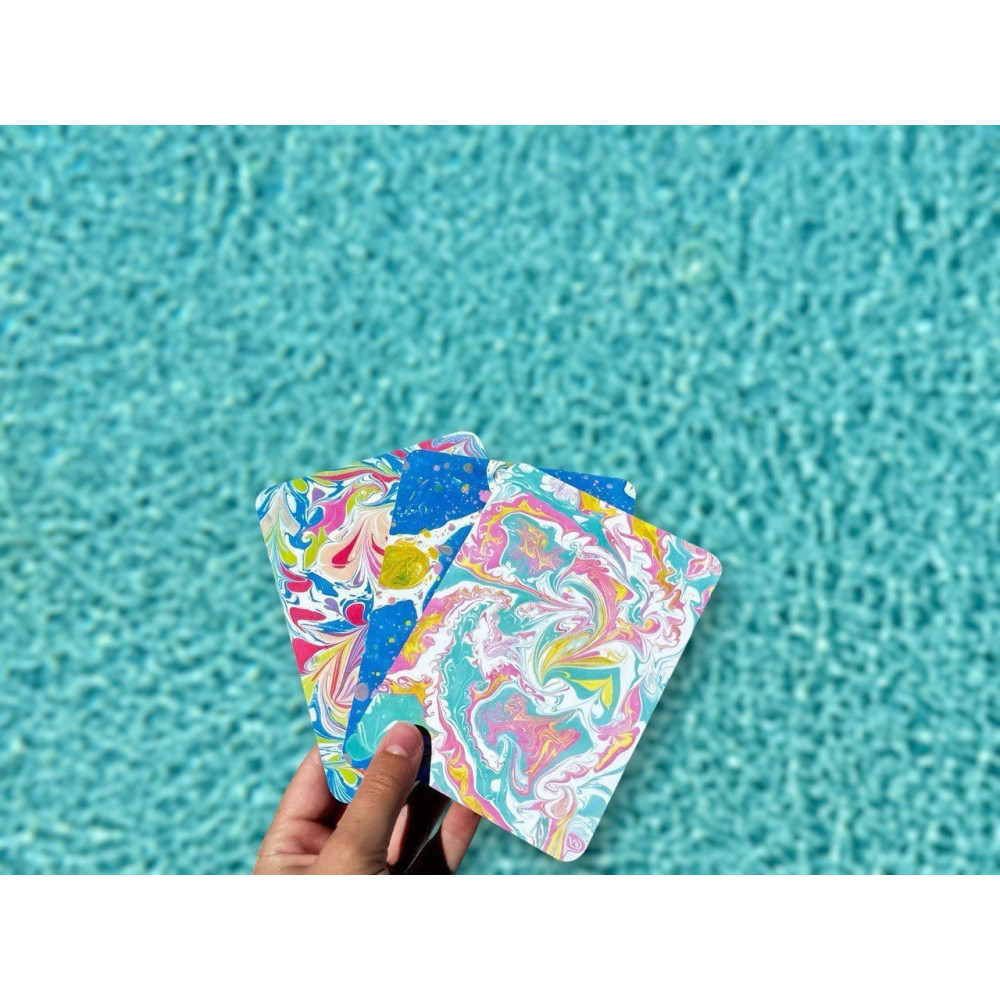 В колоде представлено 32 карты, выполненные с помощью техники Эбру – рисование на воде, являющейся древнейшей формой творческого самовыражения и медитации. Это танец красок, создающий уникальные узоры, помогающие открыть внутренние ресурсы и решать разнообразные жизненные задачи. Интуитивное рисование Эбру символизирует путешествие во «внутренний космос», где через образ, цвет и узор можно исцелить и наладить внутренние процессы.