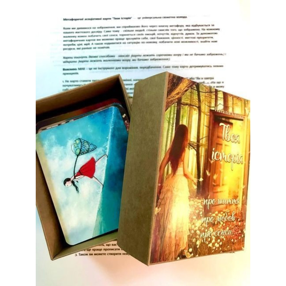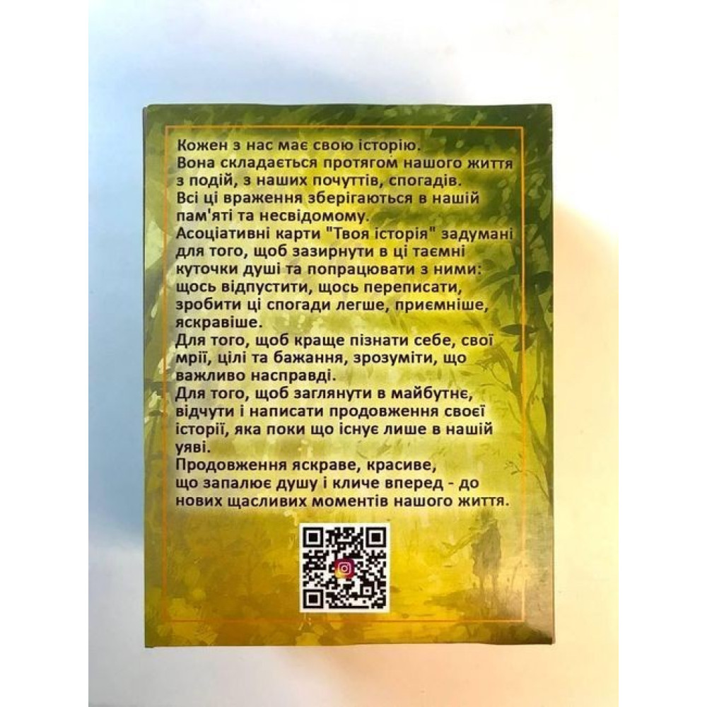 Ассоциативные карты Наталии Квитки «Твоя история» задуманы для того, чтобы заглянуть в эти тайные уголки души и поработать с ними: что-то отпустить, переписать, сделать эти воспоминания легче, приятнее, ярче. Для того чтобы лучше узнать себя, свои мечты, цели и желания, понять, что важно на самом деле. Для того чтобы заглянуть в будущее, почувствовать и написать продолжение своей истории, которая пока существует только в нашем воображении. Продолжение яркое, красивое, воспламеняющее душу и зовущее вперед — к новым счастливым моментам нашей жизни.
