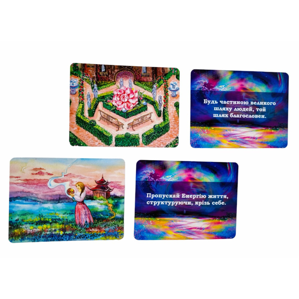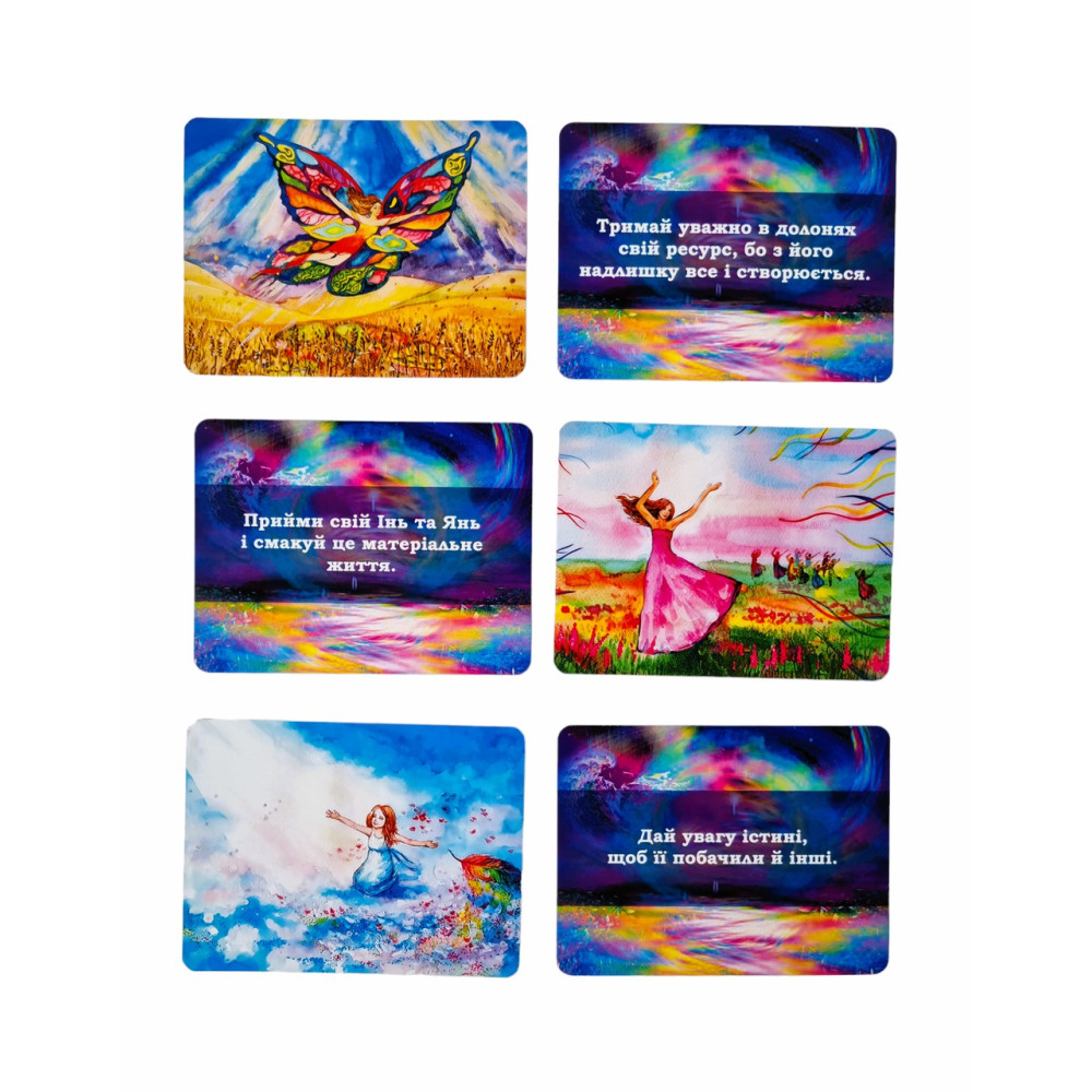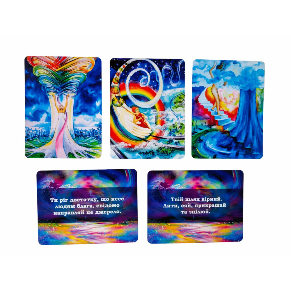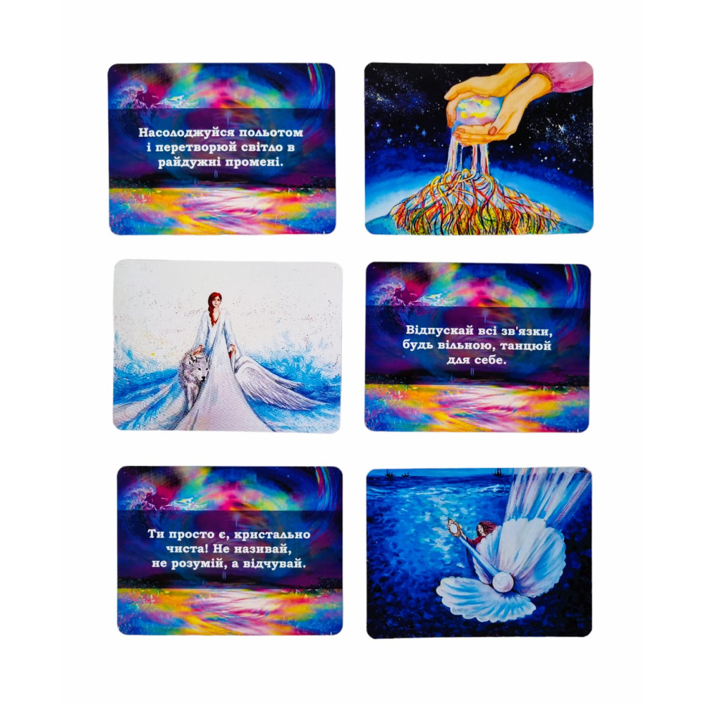 50 карт с ресурсными изображениями и текстовыми посланиями от Вселенной с обратной стороны;