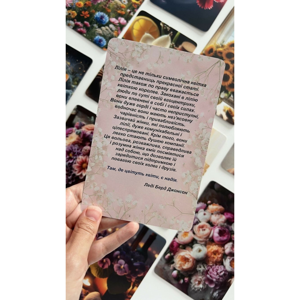 Каждая карта содержит не только изображение конкретного цветка, но и раскрывает определенные аспекты женского характера, связанные с этим цветком.