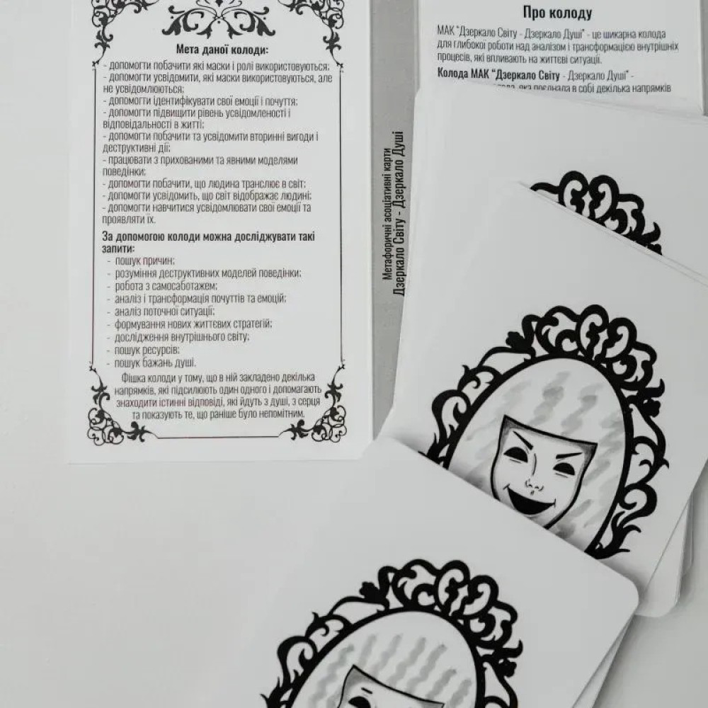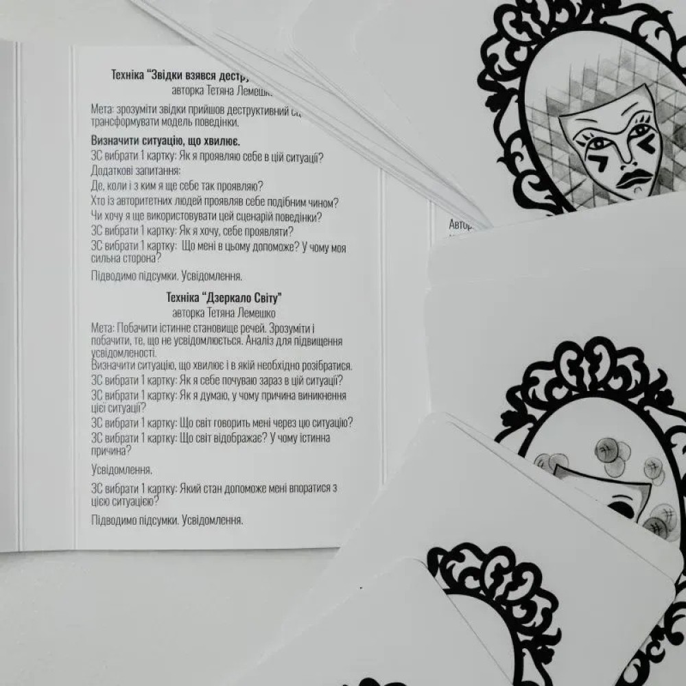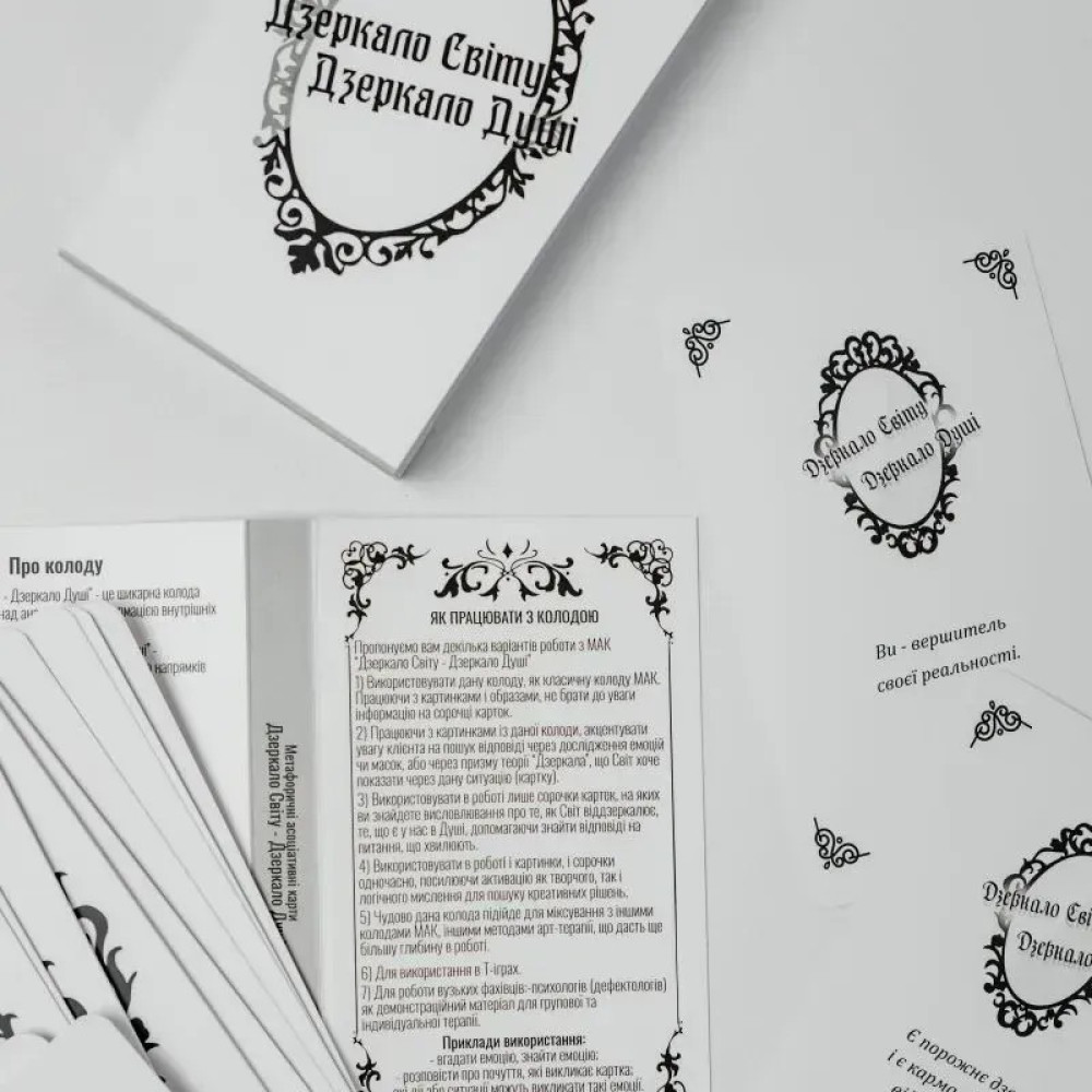 Бревно метафорических карт «Зеркало Мира. Зеркало Души» была создана Татьяной Лемешко для работы с людьми разных возрастов для поиска ответов, познания своих чувств и эмоций, для работы с масками и ролями, которые человек проигрывает в жизни.