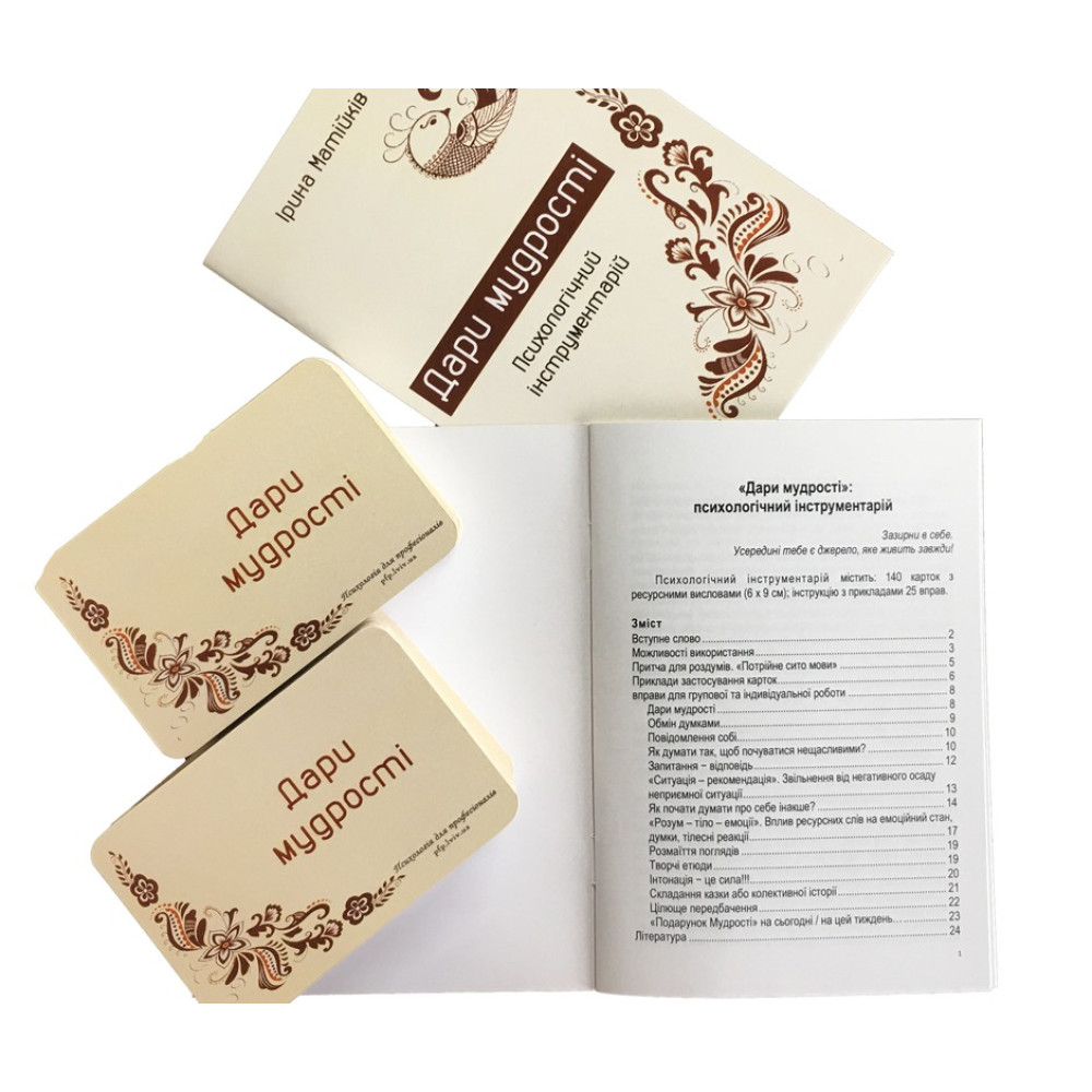 Бревно карт «Дары Мудрости» по авторству Ирины Матийков содержит 135 карт с ресурсными выражениями, улучшающими эмоциональное состояние личности; руководство с примерами 25 упражнений (24 страницы). Изготовлена из качественных материалов и имеет картонную коробку.